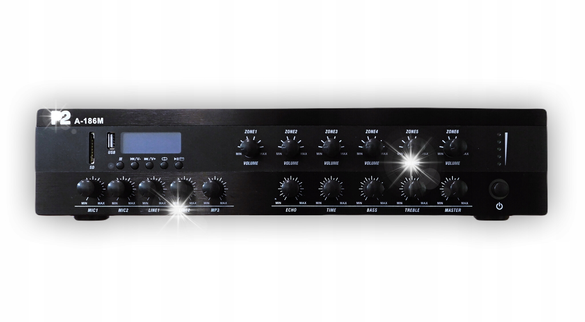 Підсилювач A-186M потужністю 180 Вт є універсальним пристроєм, який використовується для звукових систем як на 100 В, так і на омічний. Завдяки можливості регулювати гучність у шести зонах ми можемо створити комплексні звукові системи для багатокімнатних приміщень, де потрібні різні рівні звуку.