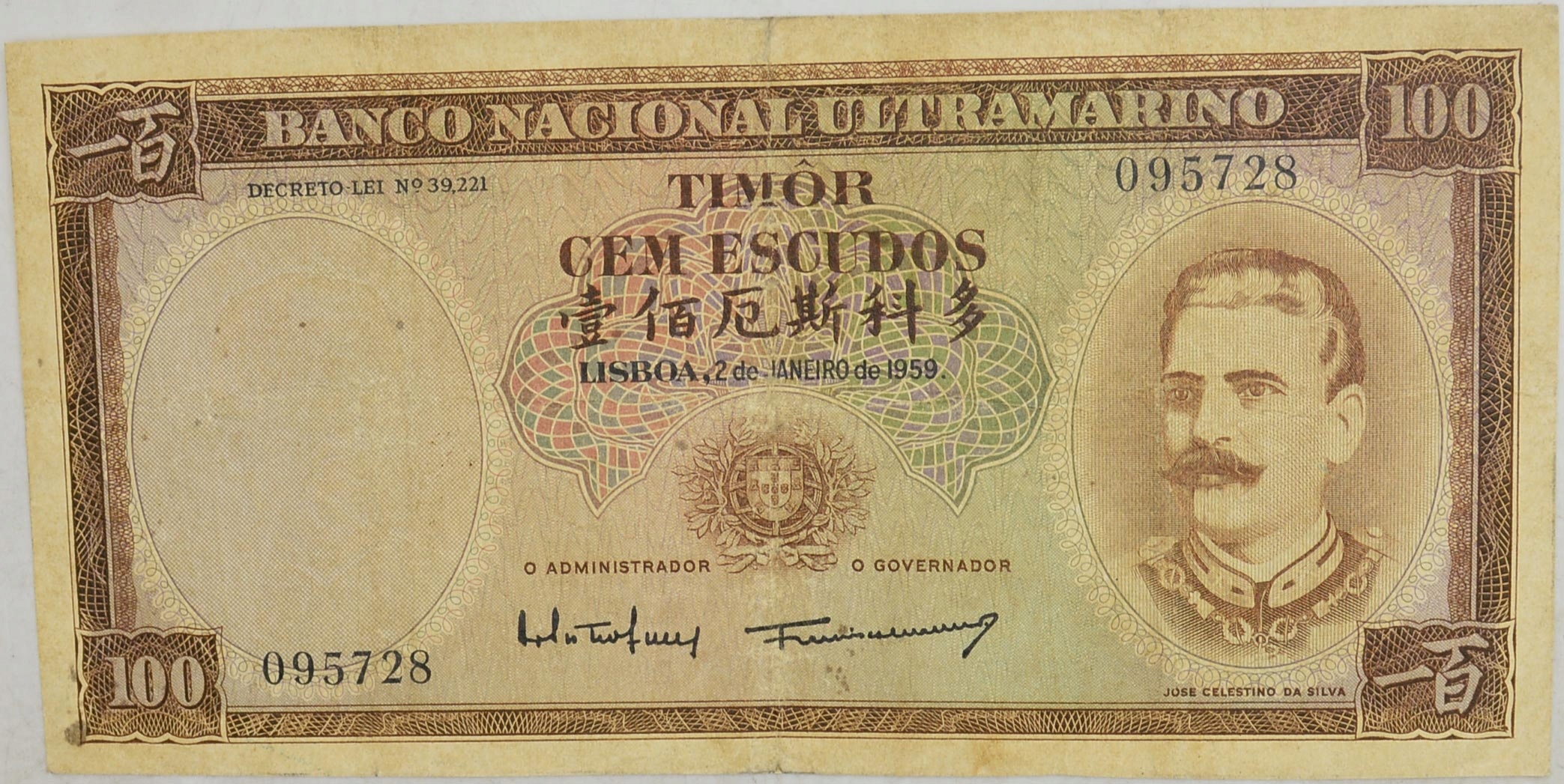 6.dir.Timor , 100 Escudos 1959 rare, St.3+