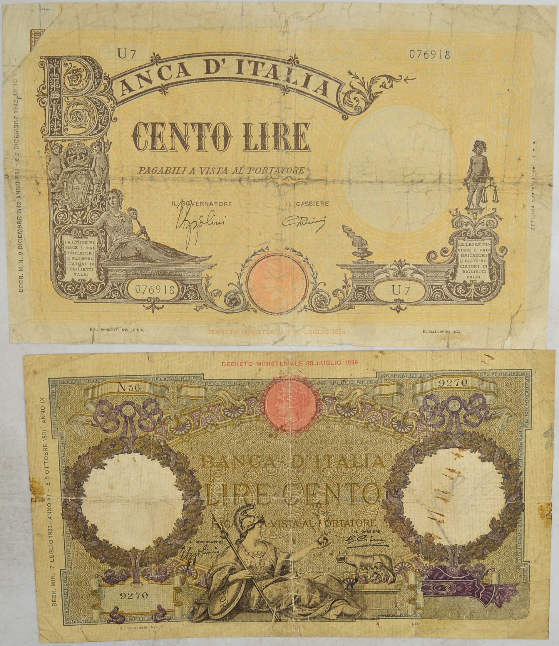 - Опис: У набір входять банкноти номіналом 100 лір 1931, 1942 рр. Рідкісні. Обидві купюри із заповненими пропущеними частинами.