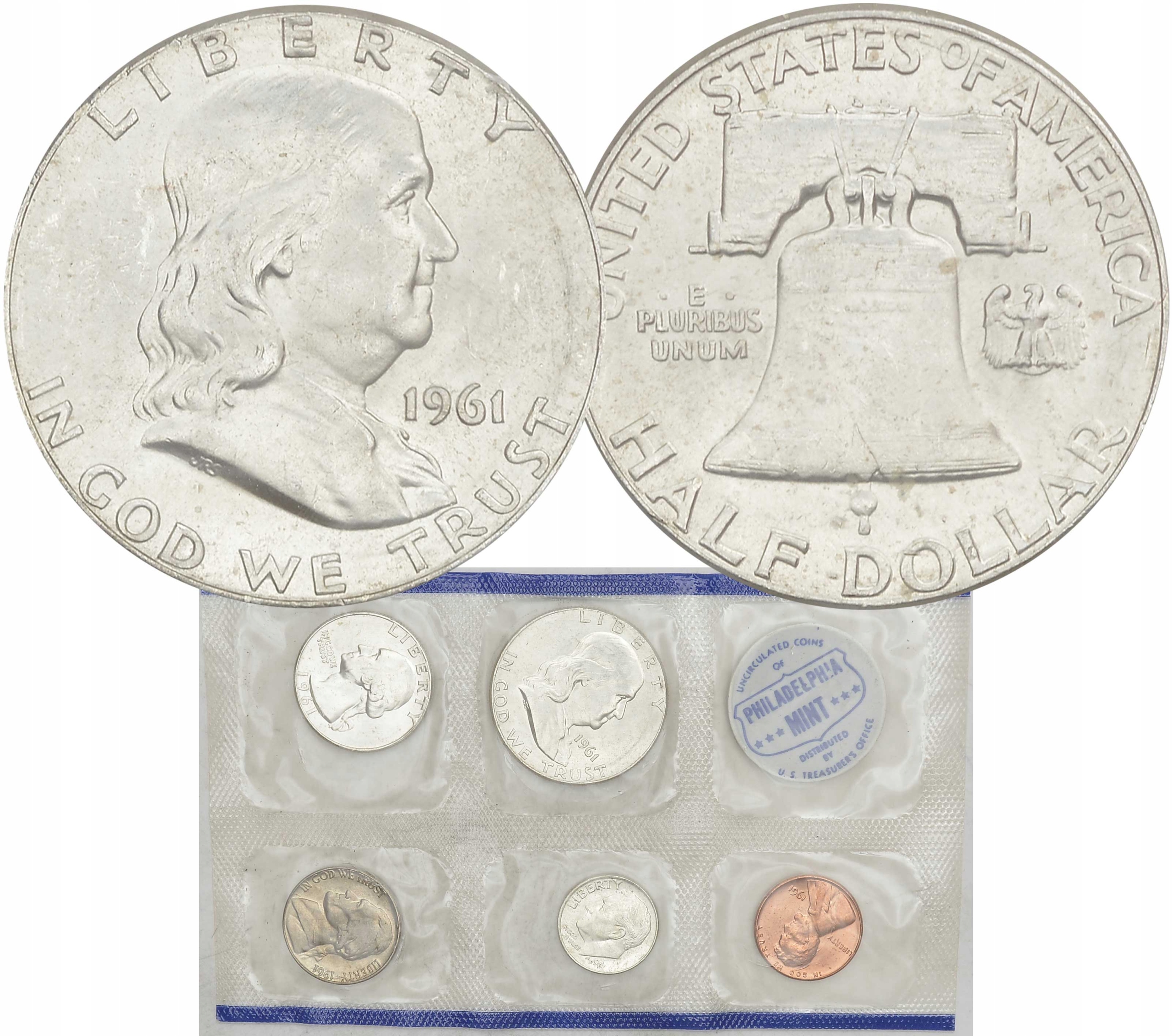 - Опис: М'ЯТНИЙ НАБІР. У набір входять монети номіналом: 1 цент, 5 центів, 10 центів (срібло), 1/4 долара (срібло), 1/2 долара (срібло) - все 1961 року + жетон монетного двору Філадельфії. Монети знаходяться в оригінальній монетній упаковці (пошкодження та розриви конверта). Фотографії монет зроблені через захисну плівку. Якщо ви виграєте більше аукціонів, вартість доставки буде визначено.