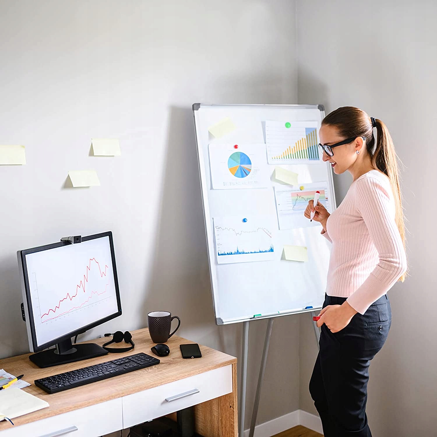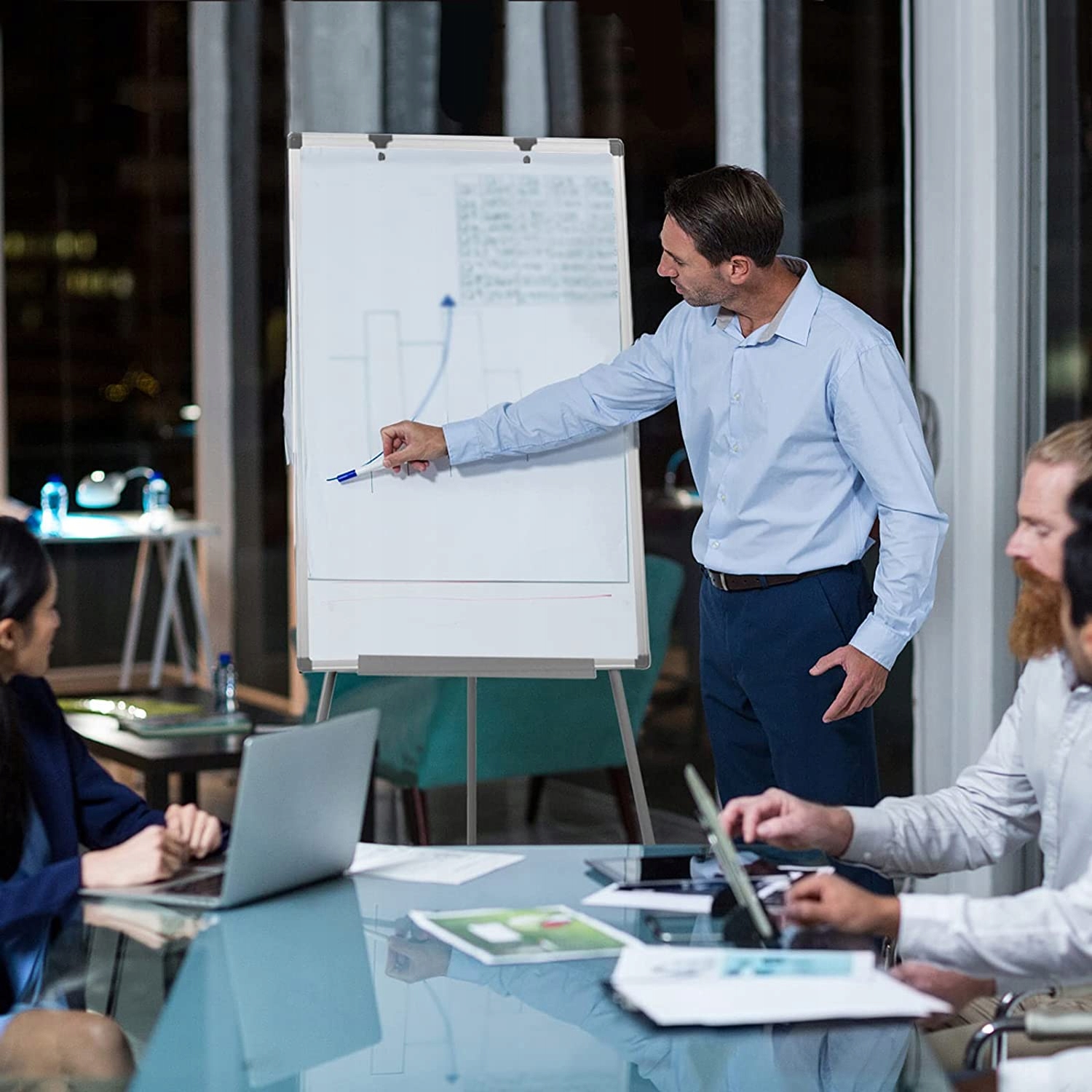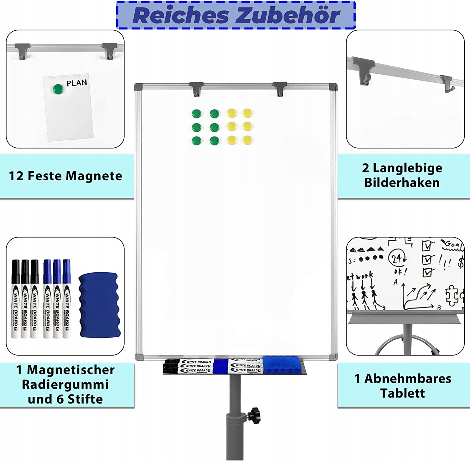 Універсальний фліпчартМатеріал дошки сухого стирання Матеріал рами МДФ Розміри дошки з алюмінієвого сплаву 90 x 60 см Доступні стилі типу A Кругла підставка з роликами Тип B Штатив без коліс. Магнітна дошка для сухого стирання. Дошка для письма складається з основи МДФ, 3-шарової магнітної дошки та захисної плівки. Нотатки можна легко позначати ручкою, що входить у комплект. Після використання записку ви можете протерти її губкою або м’якою тканиною, що додається, і дочекатися наступного використання. Мобільна дошка з аксесуарами Цей мобільний блокнот постачається з 1 знімним тримачем для ручок, 1 пінопластом, 2 гачками, 6 ручками та 12 маленькими магнітами. Його можна використовувати для повсякденних потреб в офісі та навчанні. Регульований по висоті тримач паперу можна відрегулювати відповідно до росту користувача та звичок використання. Діапазон регулювання кругла підставка типу A з колесами 120-175 см, штатив типу B без коліс 90 см 165 см. Універсальна презентаційна дошка. Ця дошка для фліпчарту легка та знімна, тому її легко транспортувати та зберігати. Широко використовується в офісах, конференц-залах, навчальних закладах, школах, магазинах, ресторанах та інших приміщеннях.