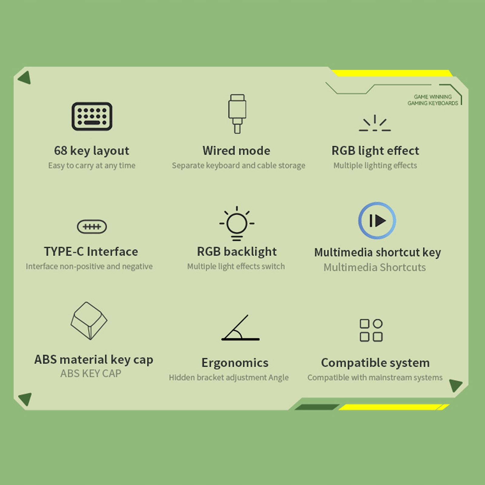 1. Компактний 60% дизайн: 68-клавішна дротова клавіатура має класичну 60% розкладку, що робить її компактною та ефективною. Ідеально підходить для будь-якого середовища, будь то ділові поїздки, ігри, робота чи домашнє використання, допоможе вам відмовитися від робочого столу.