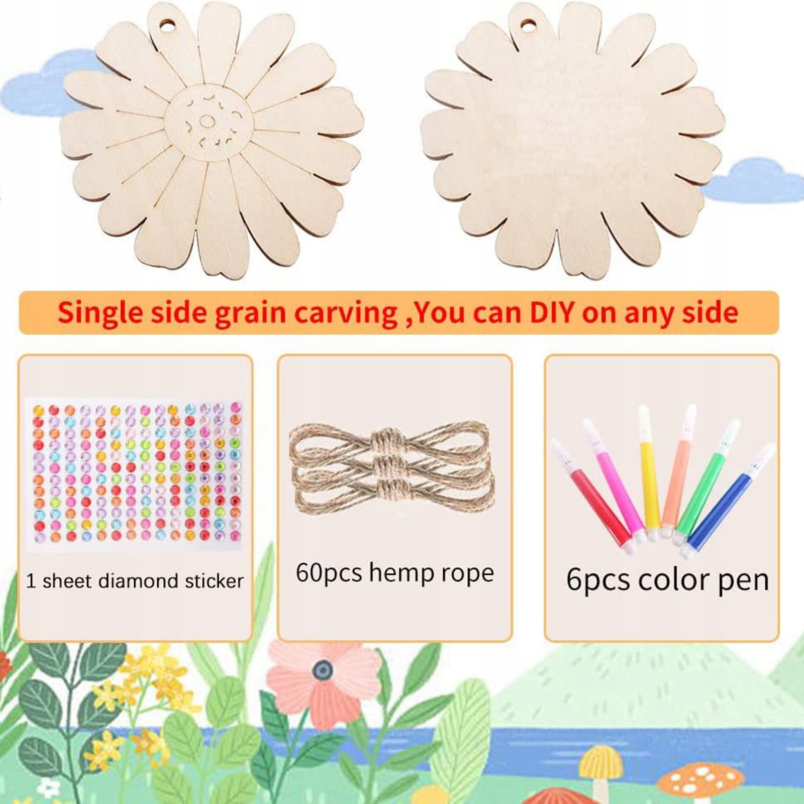 DIY randicraft: Наша дерев’яна поверхня у формі квіткових пластирів порожня, ви можете намалювати візерунок, колір, пофарбувати патч за допомогою прикріплених ручок. У ньому також є отвір, тому ви можете легко прикрасити його струнами та діамантами, які ми надаємо. Ви можете повісити його і зробити карту, завісу на дверях чи іншій прикрасі. 4