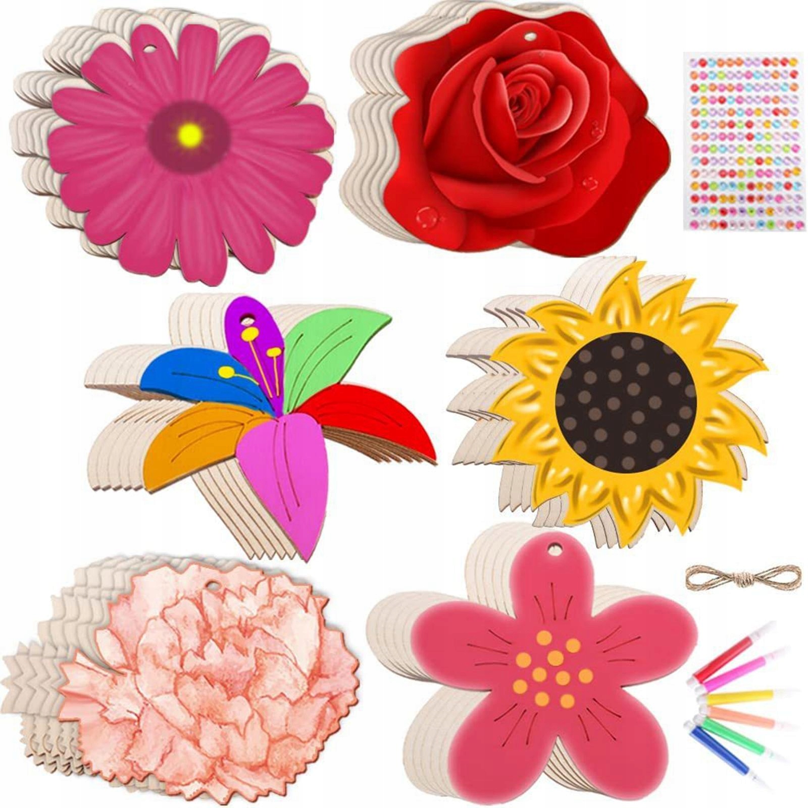 Великий: Ви отримаєте 60 розгорнутих дерев’яних зрізаних квітів у 6 стилях та різних формах, 60 мотузок, 1 аркуш діамантових наклейок, 6 штук барвистих маркерів, що достатньо для задоволення ваших різних декоративних потреб. Для багаторазового використання, щоб ви могли користуватися ними тривалий час; У них гладка поверхня, округлі краї і не запахає.
