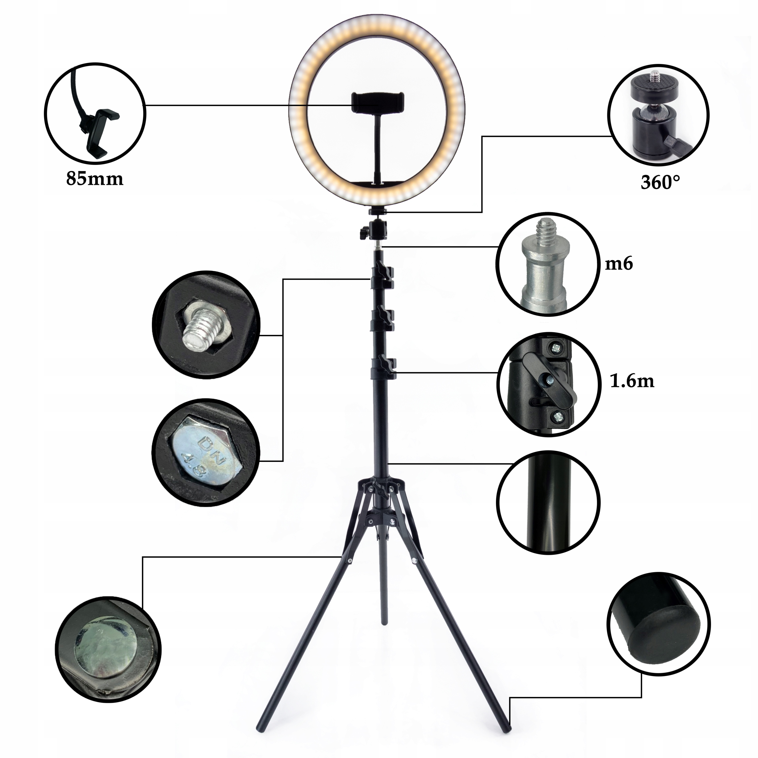 У центральному місці кільцевої лампи розташований тримач для приладу максимальною шириною 85 мм. Він має гнучкий подовжувач, завдяки якому ви можете розташувати свій смартфон під різними кутами. Це дуже корисно для людей, які роблять селфі (наприклад, макіяж), а також для фотографування продуктів і натюрмортів.