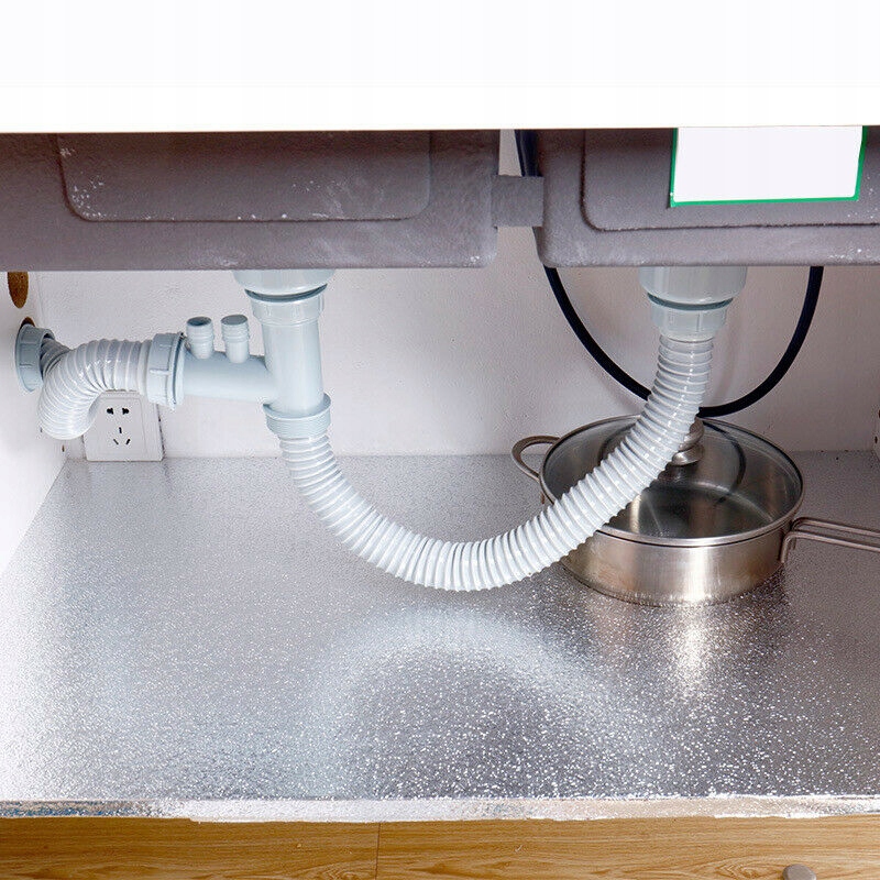 Матеріал: алюмінієва фольга + клей, стільниці, столи та підлоги. Для використання у ванних кімнатах, кухнях, шафах, пральнях, шкільних проектах, майстернях, офісах, ремісничих проектах та меблях. протікання та інші ефекти, які можна легко порізати, шафи, кухня, стіни, особливо для дренажних труб, де завжди брудно та жирно, важко чистити.