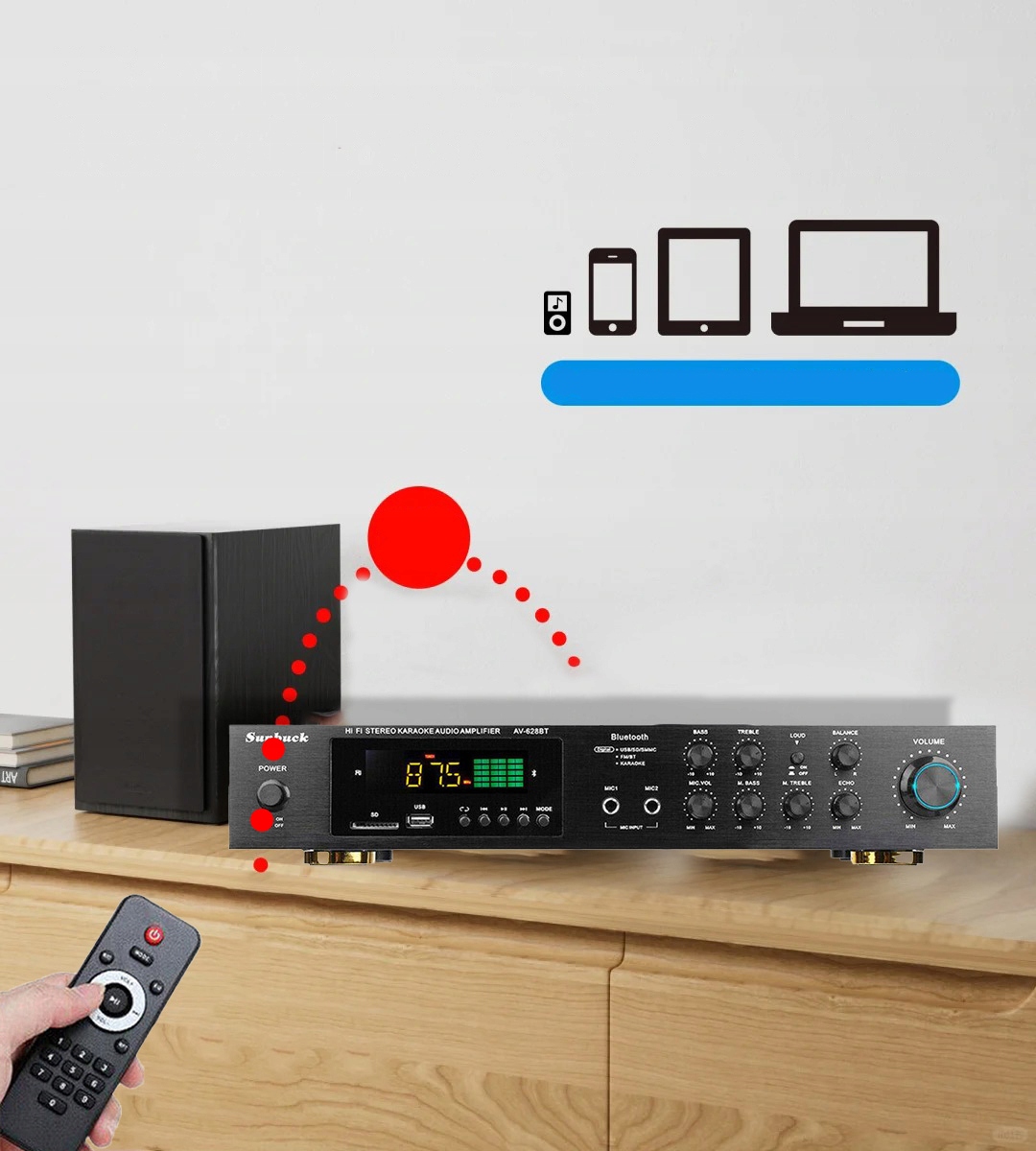 Опис:1. Цей підсилювач є багатофункціональним підсилювачем об’ємного звуку, який підходить для HiFi, домашнього кінотеатру або невеликих PA та караоке-вечірок!2. Стереовходи RCA та входи гнізда можна підключати до всіх типів аудіопристроїв, таких як MP3-плеєри, DVD-плеєри та комп’ютери3. Будучи корисним доповненням до функцій HiFi та домашнього кінотеатру, він має два входи для мікрофона на передній панелі для здійснення дзвінків на вечірках PA, караоке-вечірках або зустрічах.4. Пристрій також має вбудований радіотюнер, який дозволяє налаштуватися на всі ваші улюблені радіостанції.