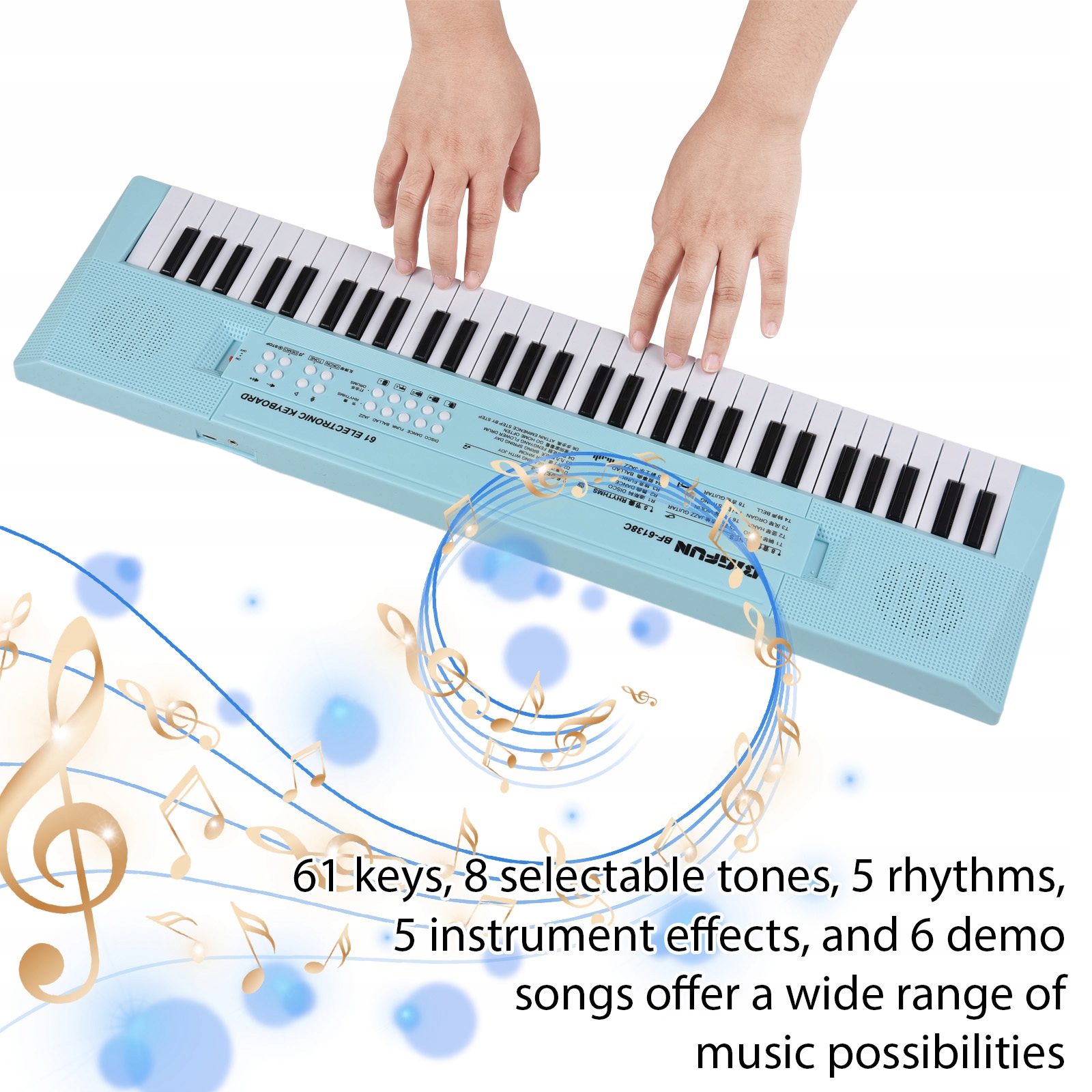 【багатий музичний вибір】: оснащені 61 клавіш, 8 вибраних тонн, 5 ритмів, 5 ефектів інструментів та 6 демонстраційних пісень, електричне фортепіано клавіатури забезпечує широкий спектр музичних можливостей. Користувачі можуть виявити різні звуки та стилі, а демонстраційні пісні служать корисними інструментами навчання.