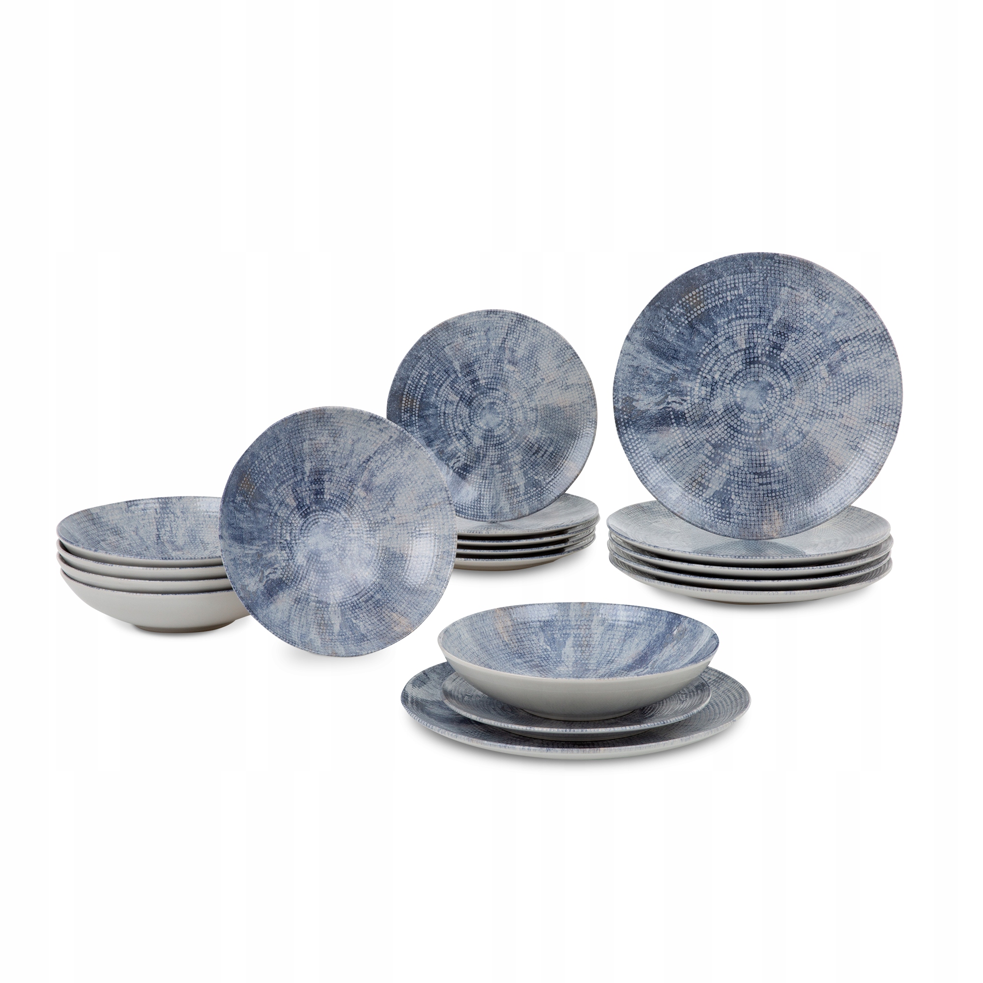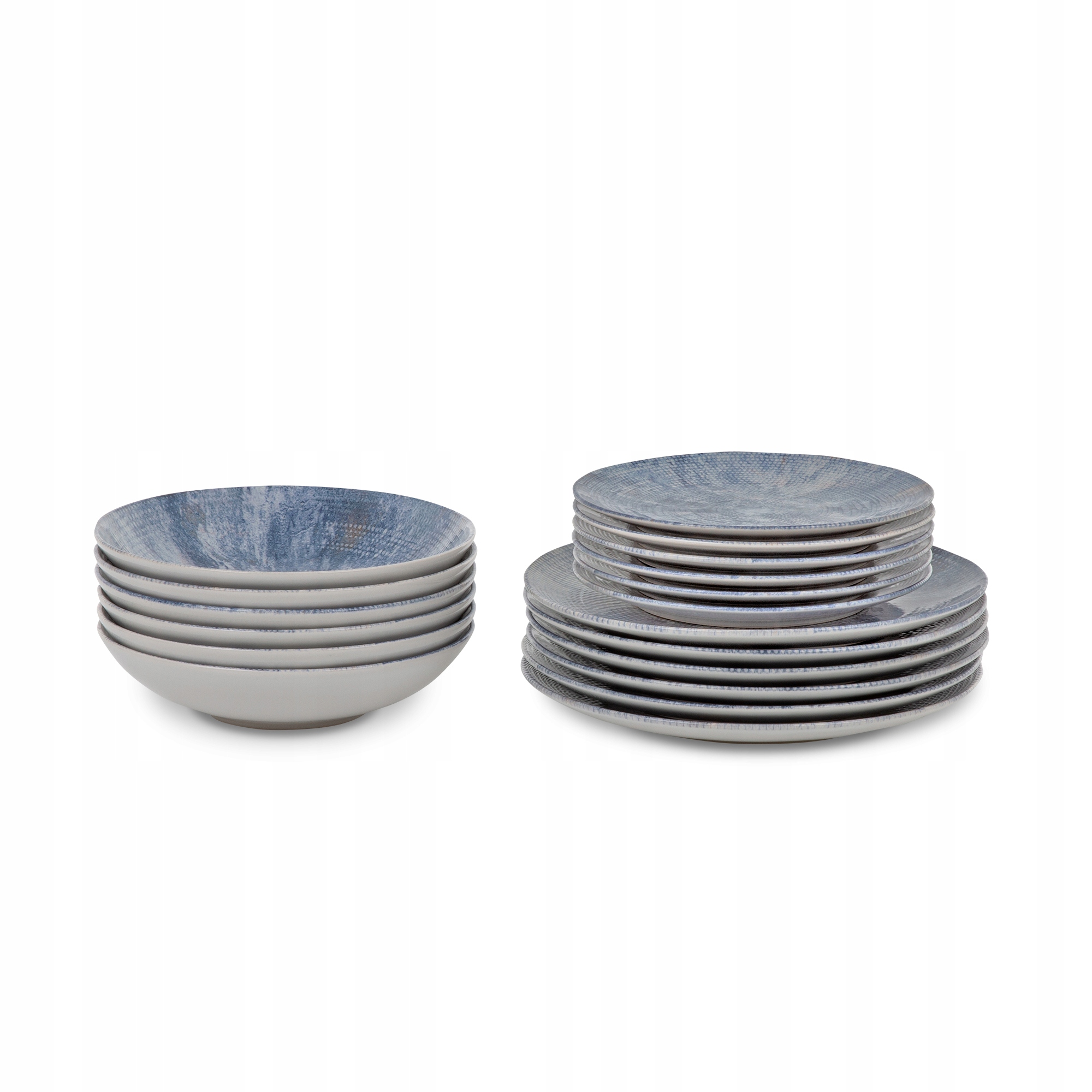 Керамічний набір на 6 осіб поєднує функціональність із художнім дизайном. Завдяки техніці реактивної глазурі кожна тарілка радує неповторним синім мозаїчним малюнком. Це ідеальний вибір для любителів оригінальних деталей і сучасного стилю.