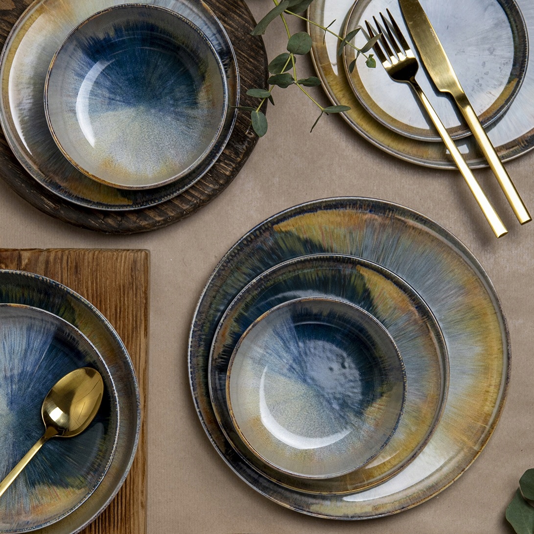Керамічний набір для 6 людей, закінчених реактивною глазур'ю, - це поєднання мистецтва та функціональності. Кожна тарілка прикрашена динамічним променистом, який був створений завдяки реакції емалі в процесі стрільби. Це пропозиція для людей, які шукають страви з персонажем, відповідність стильних інтер'єрів та особливих моментів за столом.