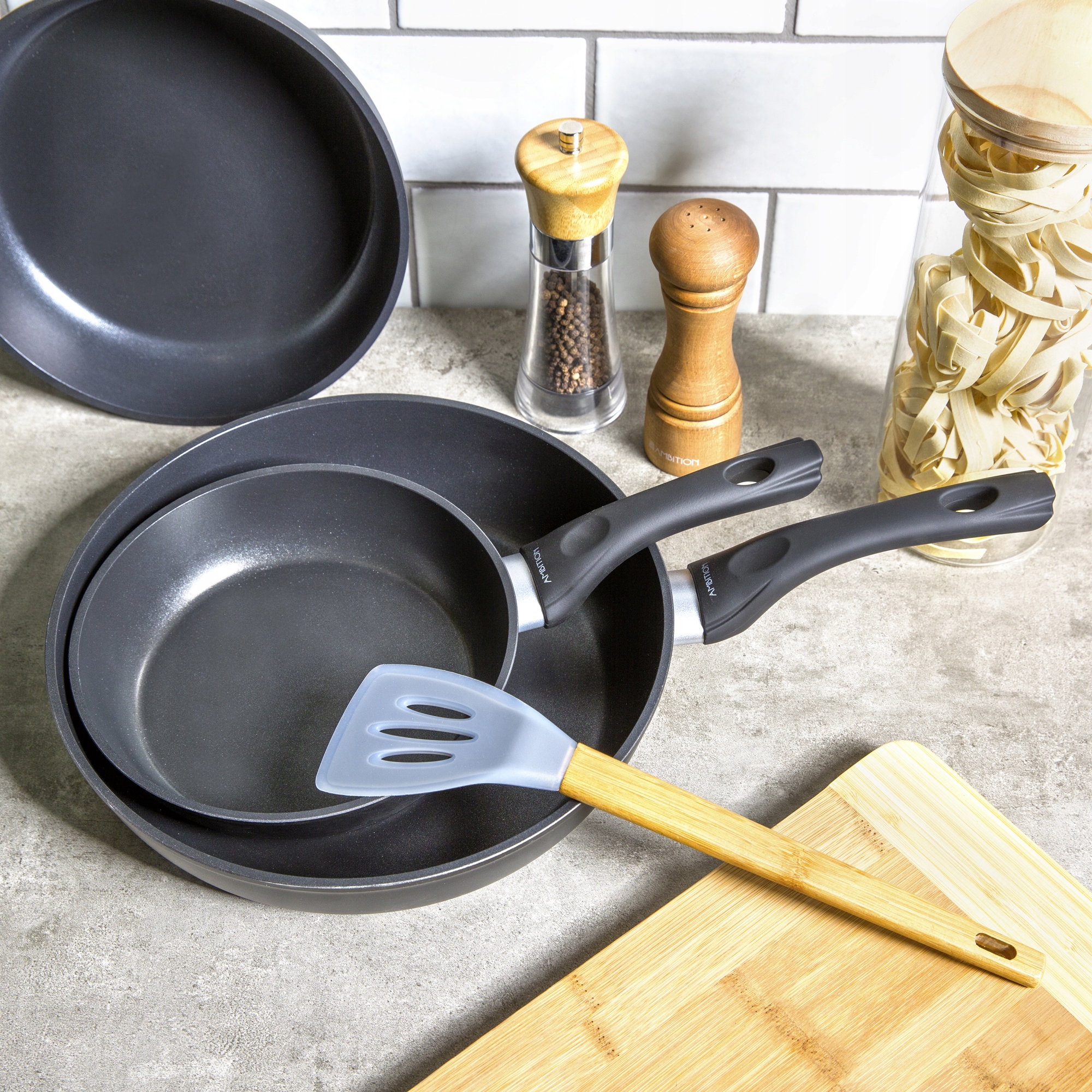 Набір сковорідок Magnat від Ambition виготовлений за технологією кованого алюмінію, завдяки чому сковорідки швидко і рівномірно нагріваються, а також дуже міцні і стійкі до деформацій. Всередині сковорідки покриті оригінальним швейцарським антипригарним покриттям ILAG Non-Stick Premium. ILAG Premium - це 3-шарове покриття з відмінними антипригарними властивостями, надзвичайно стійке до подряпин і стирання. Підходять для використання на всіх типах плит, включаючи індукційні. Сковороди Magnat з покриттям ILAG Premium - ідеальне рішення для всіх, хто цінує високу якість.
