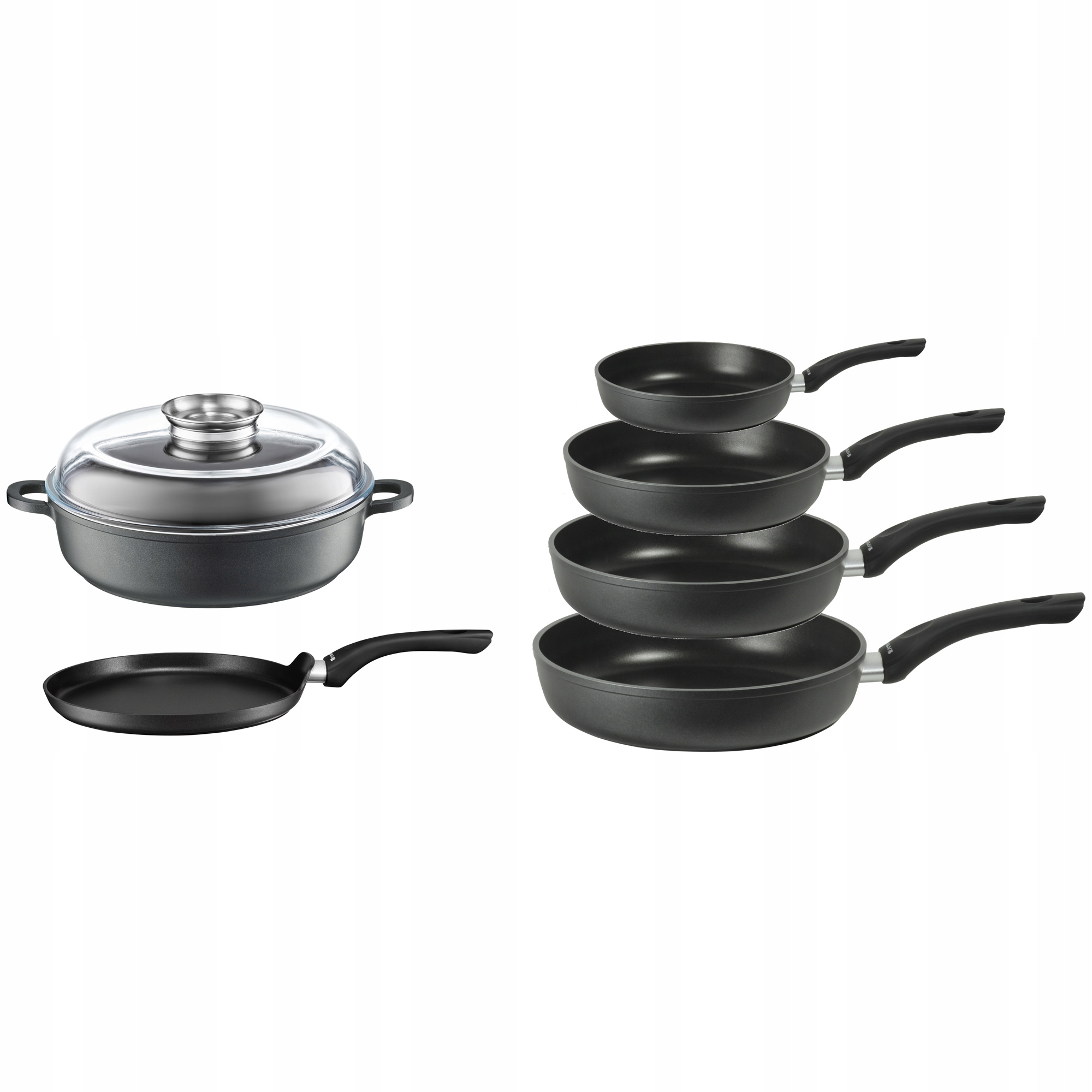 У набір також входить жаровня/сковорода, яка, крім усіх індукційних плит, є також підходить для використання з духовкою з кришкою. Кришка також має спеціальний дозатор масла/води, так званий Aroma Knob. Це дозволяє поповнювати рідину під час випічки, не піднімаючи кришку. Це інноваційне рішення дозволяє зменшити втрати солі та природних мінералів у приготованих стравах. Сковорода та млинниця також виготовлені за технологією кованого алюмінію та вкриті зсередини оригінальним швейцарським антипригарним покриттям ILAG Premium. Це багатошарове покриття з чудовими антипригарними властивостями, зміцнене керамікою та стійке до подряпин.