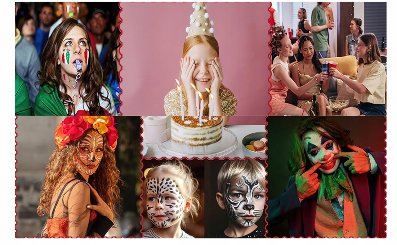 ✅ години. Фарби, що базуються на воді, дуже зручні, просто зволожуйте пензлик або розпилення трохи води, щоб пом’якшити поверхню макіяжу, а потім нанести фарбу на обличчя або також може бути використаний як фарба для тіла. Його можна легко очистити вологою тканиною або мильною водою, не залишаючи слідів.