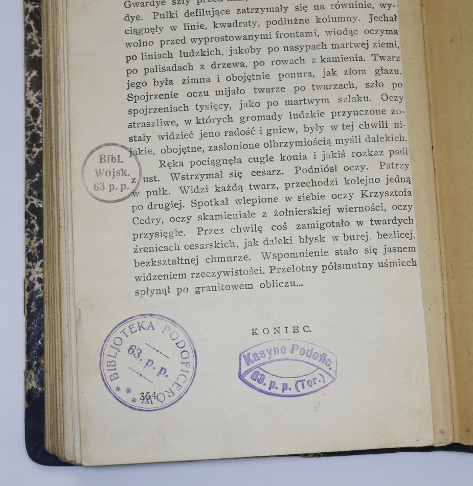 Оригінальна дуже цікава, рідкісна довоєнна публікація, 63-й піхотний полк Торунь, Бібліотека унтер-офіцерів, унтер-офіцерське казино, Popioły, Stefan Żeromski, видавництво J. Mortkowicz, Варшава 1927; 354 сторінки, під численними печатками Військових бібліотек 63-го піхотного полку, тверда обкладинка, крапка, стан хороший+. Надзвичайно цікавий, дуже рідкісний предмет. Стан добре видно на фото в описі аукціону.
