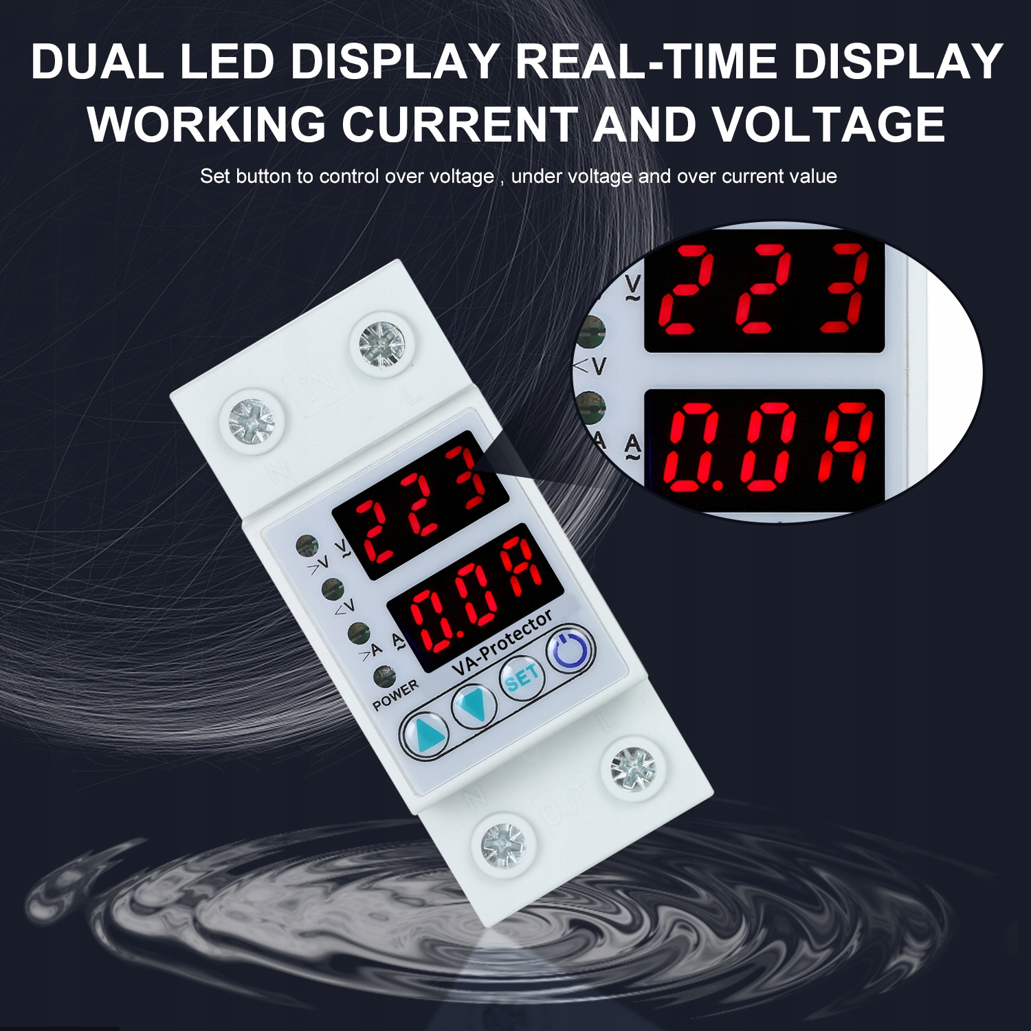 • Подвійний світлодіодний дисплей Регульований струм підходить для однофазного змінного струму 220V, 50/60 Гц, номінального робочого струму 63a.  В основному він використовується для введення домашніх будинків або надмірного напруги, неіснуючого напруги або надмірного захисту струму лінії розподілу для однофазних електричних пристроїв. Основна його особливість полягає в тому, що схема має надмірну напругу або подання, надмірні проблеми з струмом, продукт може негайно відрізати джерело живлення для захисту електричного обладнання від пошкоджень, крім того, захисник може автоматично включати джерело живлення, коли напруга схеми повертається до нормального.  Надмірна напруга, неіснуюча напруга та надмірний струм цього продукту можуть бути налаштовані самостійно і можуть бути адаптовані на основі місцевого практичного стану.