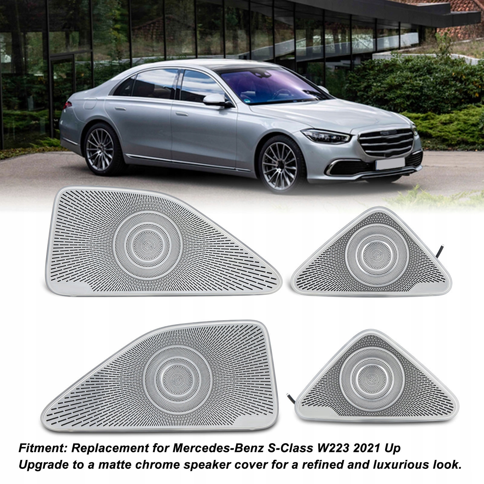 Функція: 1. Встановлення: набір обкладинки динаміків середнього діапазону з світлодіодним освітленням, ідеальна заміна для Mercedes-Benz S-класу W223 2021 вгору.