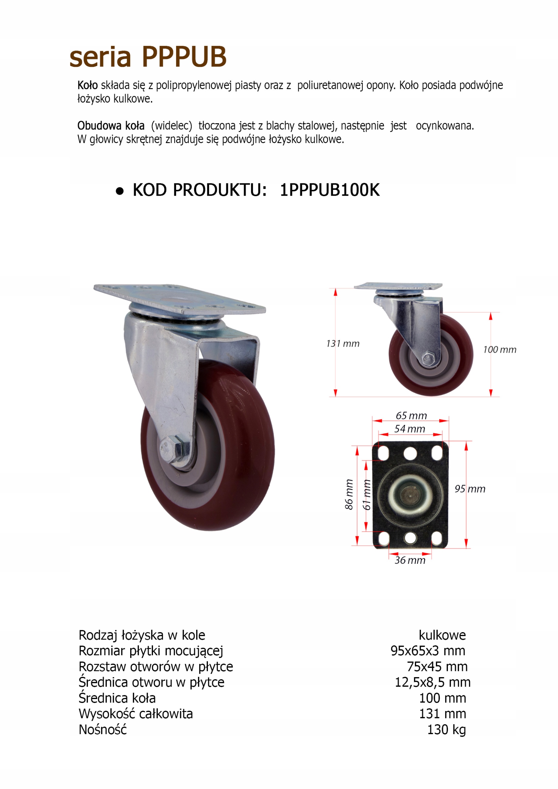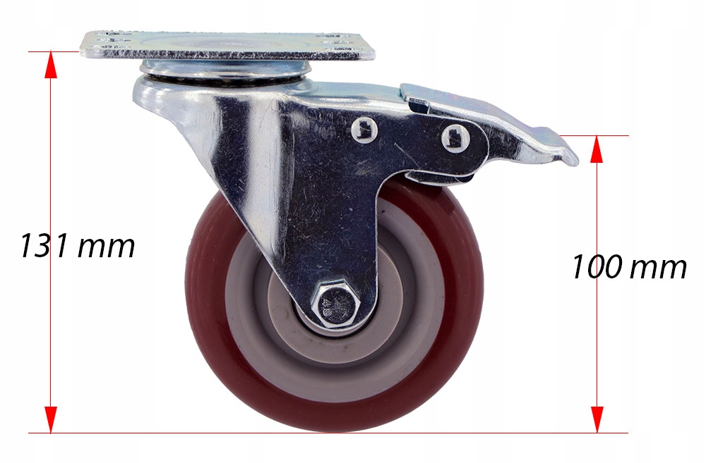 - Корпус Виготовлені сталеві листи з високою довжиною. Плитка має розміри 95x65x3 мм. Колеса мають діаметр 100 мм, а центри кріплення мають розмір 75 х 45 мм і овальні отвори для кріплення розміром 12 х 8,5 мм. Загальна висота становить 131 мм + 125 мм. Колеса мають силу 130 кг на коло. Вони використовуються повільно, вони стійкі до пошкодження, поглинання ударів та вібрацій. Вони обертають 360 градусів, полегшуючи маневрування меблями або коляскою. Вони плавно обертаються на твердих і гладких поверхнях, як бетон з дуже маленьким тертям.