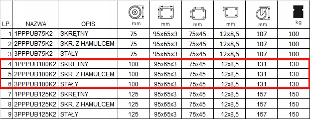 Набір складається з чотирьох коліс, оснащених кріпленням тарілки. Набір включає два постійних наборів з кодом 3PPPUB100K2 (пункт 6 у таблиці), одне кружне колесо з кодом з кодом 2pppb100k2 (пункт 5 в таблиці) та одне кругообіг з кодом 1ppub100k2 (пункт 4 у таблиці) + фути. 4