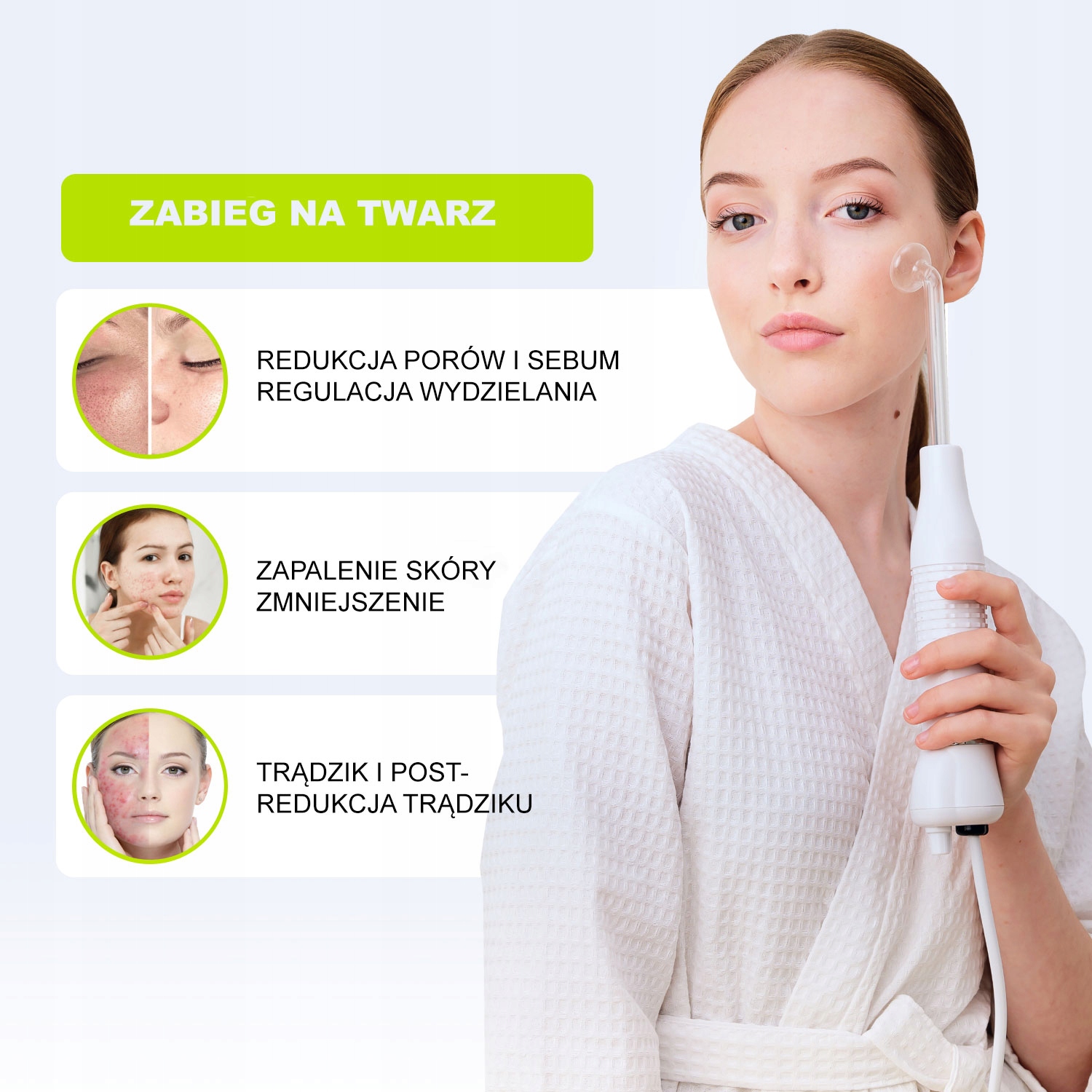 Запалення шкіри. Курс включає 10-15 процедур. Використовуйте пристрій протягом 10 хвилин.