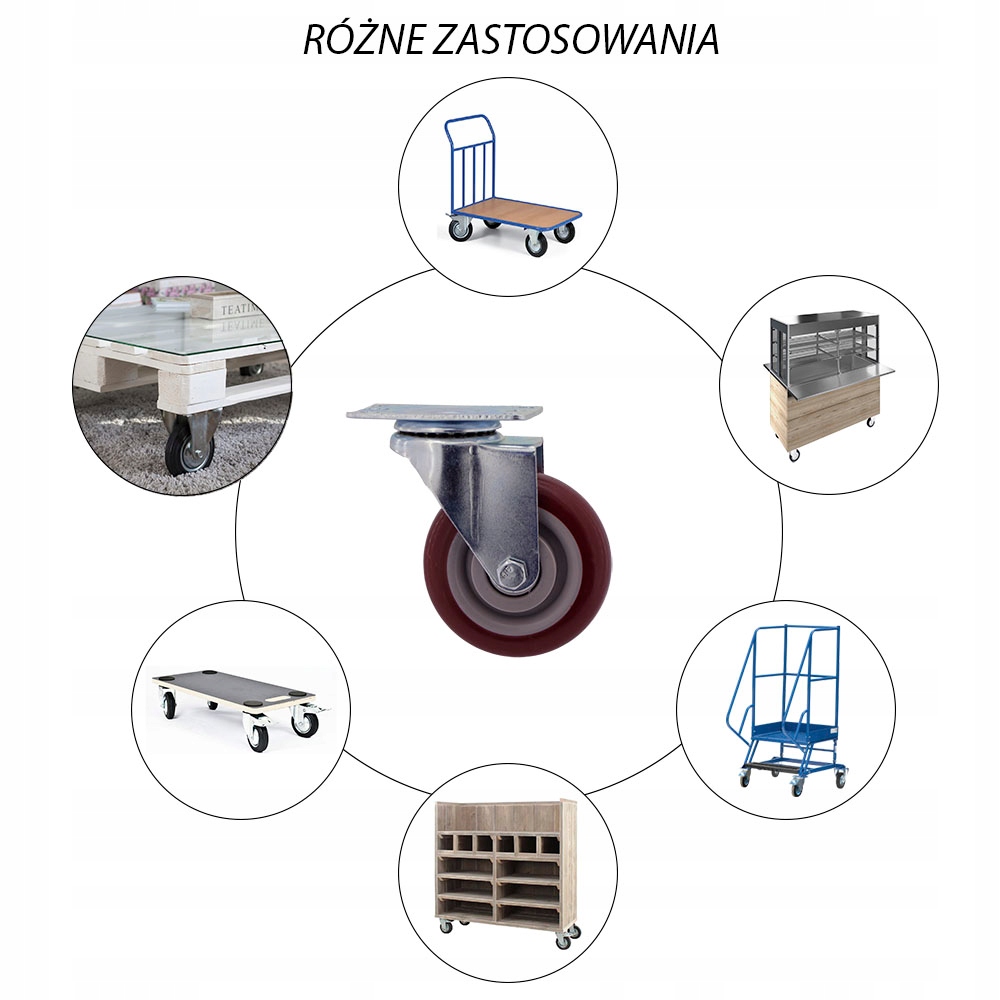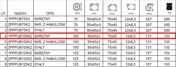 - Корпус Виготовлені сталеві листи з високою довжиною. Плитка має розміри 95x65x3 мм. Колеса мають діаметр 100 мм, а кріплення центри - розміром 75 х 45 мм, а овальні отвори для кріплення розміром 12 х 8,5 мм. Загальна висота становить 131 мм + 125 мм. Колеса мають силу 130 кг на коло. Вони використовуються повільно, вони стійкі до пошкодження, поглинання ударів та вібрацій. Вони обертають 360 градусів, полегшуючи маневрування меблями або коляскою. Вони плавно обертаються на твердих і гладких поверхнях, як бетон з дуже маленьким тертям.