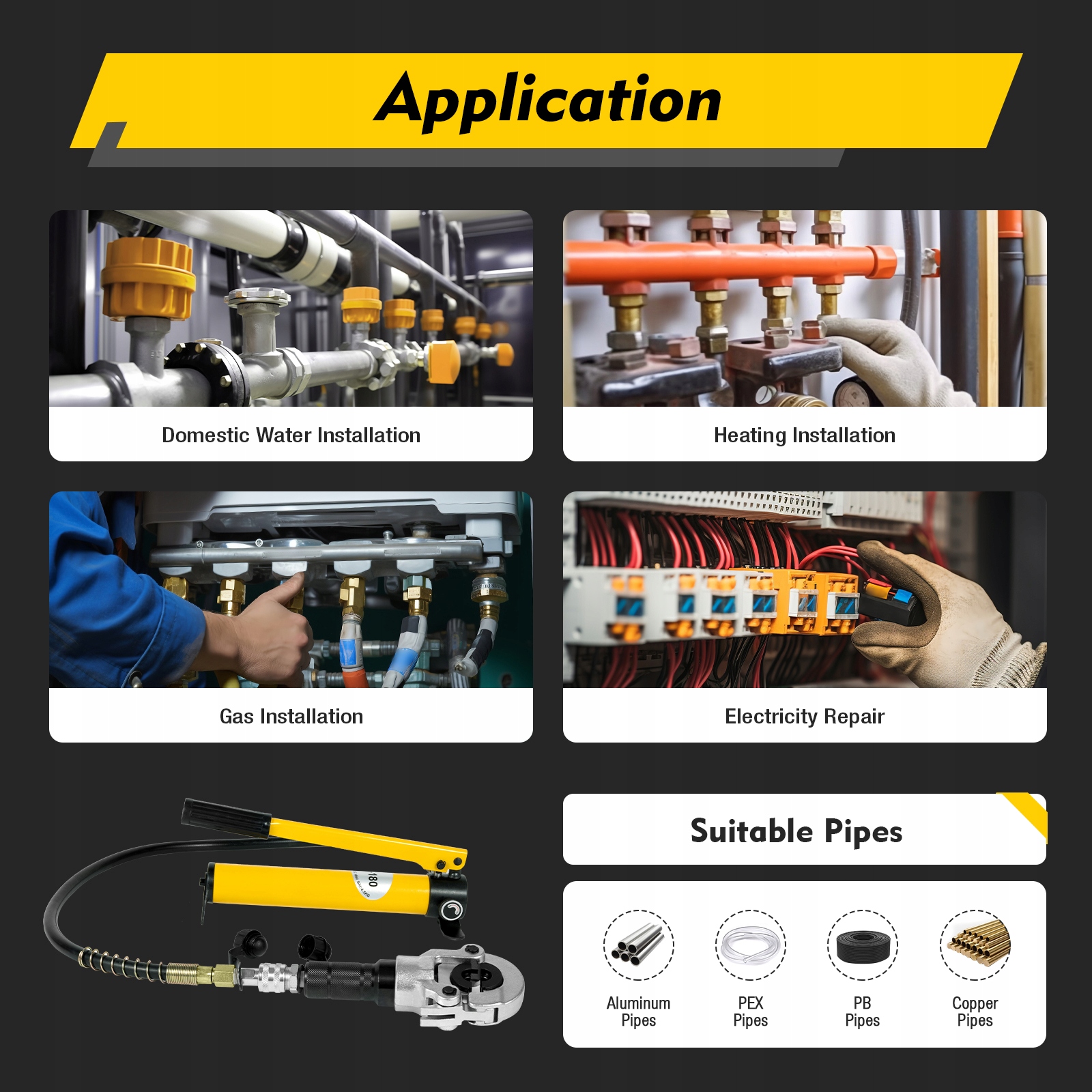 Чи є у вас проблеми, що стискають труби? Ви хочете покращити свою роботу? Ви не можете пропустити наш гідравлічний інструмент! Наш гідравлічний інструмент містить ковану та обертову головку гідравлічних плоскогубців, ручний гідравлічний насос і довгий гумовий гідравлічний шланг, який є міцним і міцним. Інструмент також має 9 матриць різних розмірів, що може значно підвищити ефективність роботи.