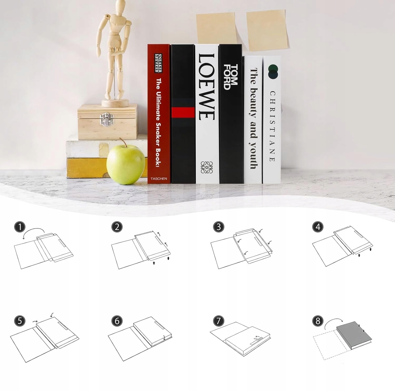 Книги-імітації легкі, міцні та естетично виготовлені, тож ви можете розкладати їх, складати стопками або поєднувати зі справжніми книгами, створюючи унікальну композицію. Це практичне рішення для оформлення вітальні, кабінету чи книжкової шафи.