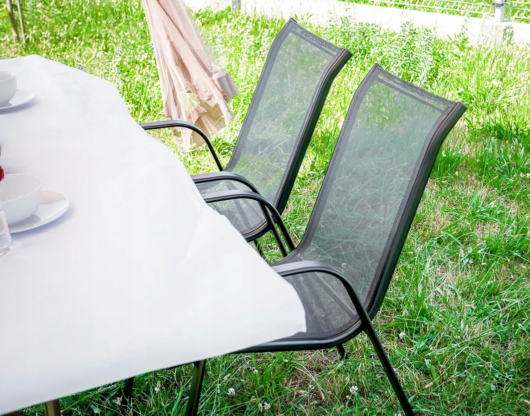 Садове крісло від RahheGarden виготовлено з матеріалів найкращої якості, що забезпечує високу міцність і дуже хорошу якість якість виготовлення виробу. Сучасний і елегантний дизайн ідеально впишеться в існуючий сад. Наше крісло добре працює на балконі, терасі та в саду. Каркас має подвійне порошкове покриття, що ідеально адаптує цей продукт для використання всередині та на вулиці. Сидіння та спинка стільця виготовлені з чорної гнучкої текстильної оббивки для максимального комфорту. Крісла мають два підлокітники. Використані матеріали не вимагають догляду, стійкі до погодних умов і не вимагають спеціальних засобів догляду. Ніжки додатково оснащені пластиковими накладками