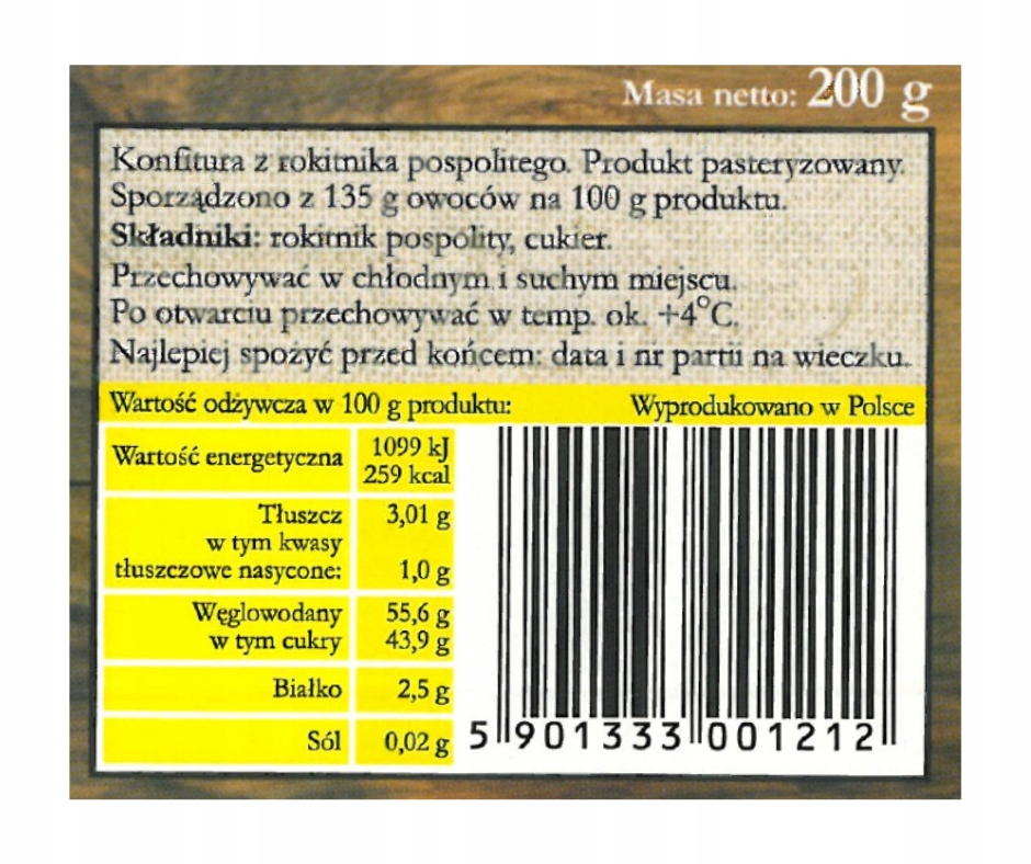 Продукт складається з 135 г фруктів на кожні 100 г продукту. Інгредієнти складаються з 65% обліпихи та цукру.