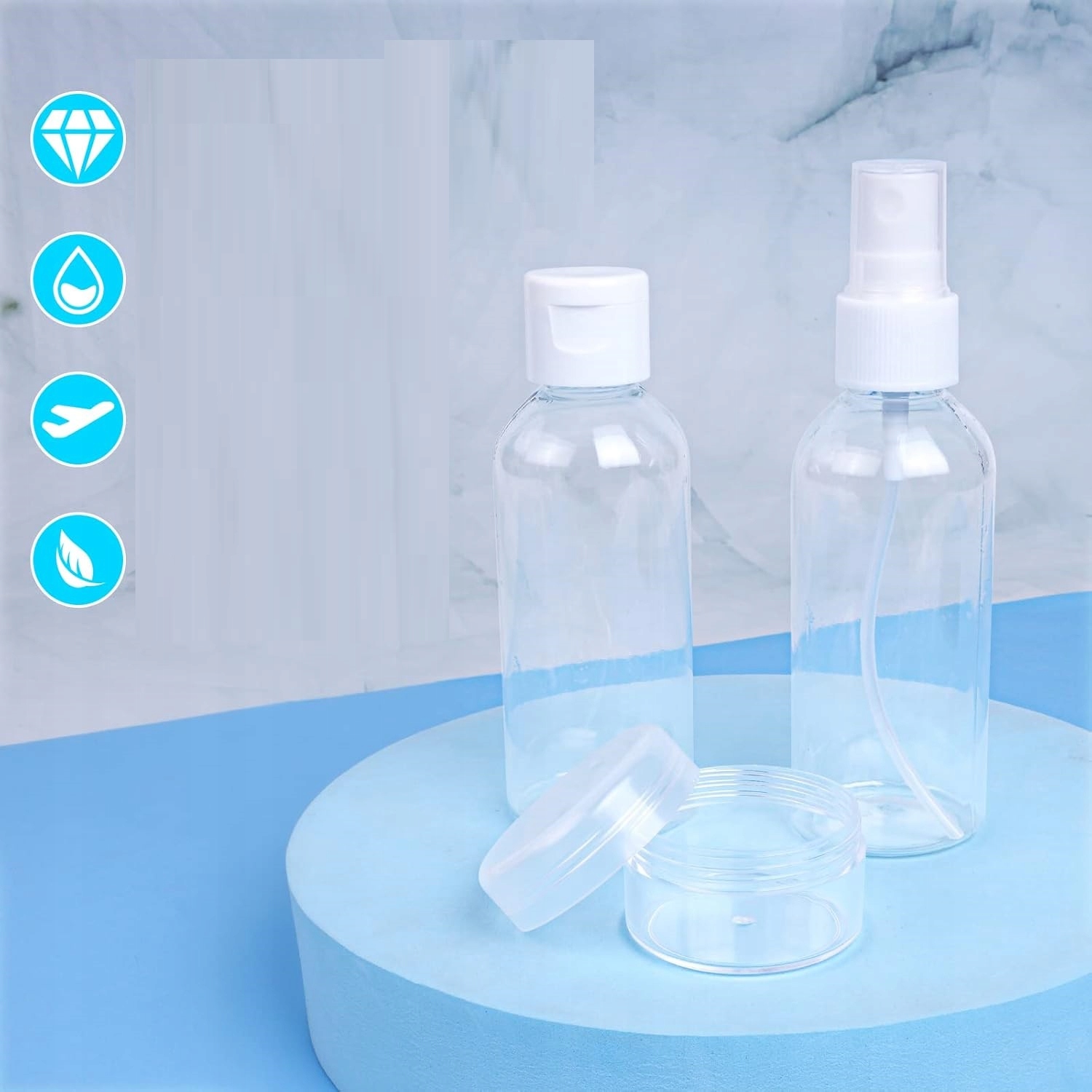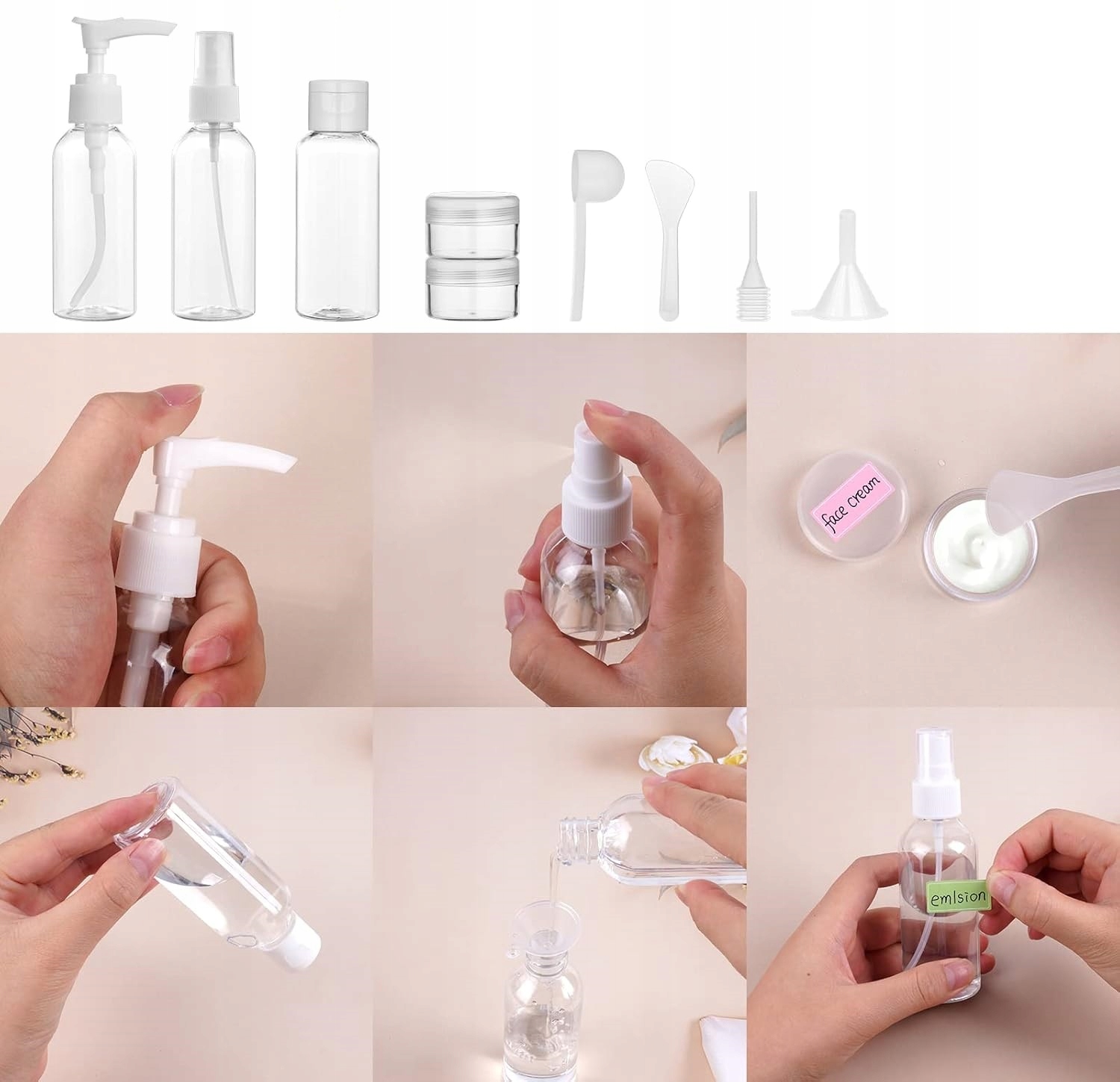 4 Виготовлені з високоякісної, легкої пластики, пляшок є практичними та функціональними, ідеально підходять для зберігання косметики, рідин та інших гігієнічних продуктів. Завдяки доданим мітками ви можете легко позначити вміст, що дозволить швидко знайти продукт.
