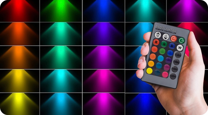 у комплекті 6 лампочок GU10 RGB, які керуються пультом дистанційного керування потужністю 3 Вт, і 6 патронів GU10