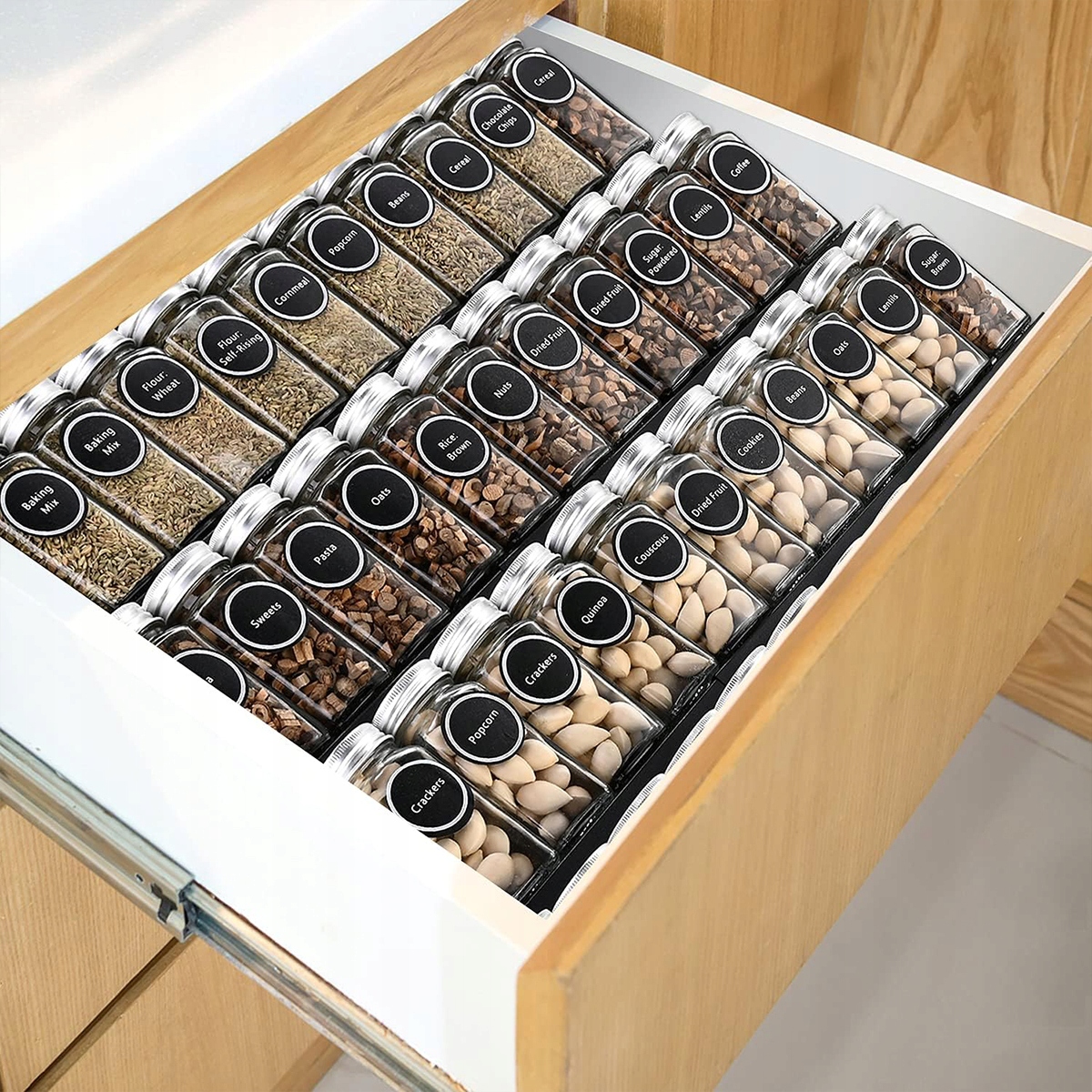 Полиці для спецій мають 3 яруси з 6 окремими частинами, і їх можна використовувати окремо або парами в ряд, збільшуючи висоту від 23 см до 46 см. Ви можете зберігати різноманітні баночки для спецій. Незалежно від довжини шухляди, ви можете відрегулювати її до відповідного розміру, пересуваючи її.