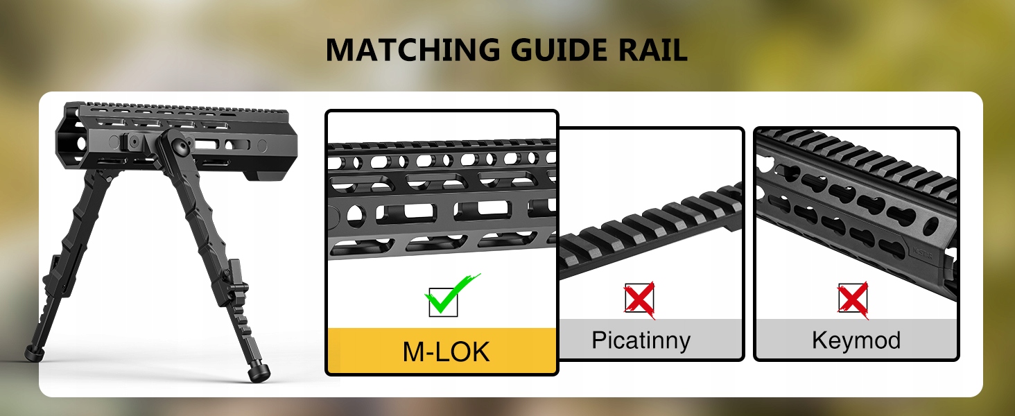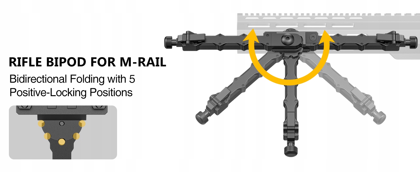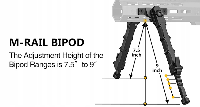 dwójnóg можна прикріпити до русла в положеннях 3 і 9 і забезпечує чітку нижню рейку. Лише одного удару достатньо, щоб відрегулювати напрямок ніг, сповільнити, а ноги ковзають вниз і блокувати на місці за допомогою пружин.