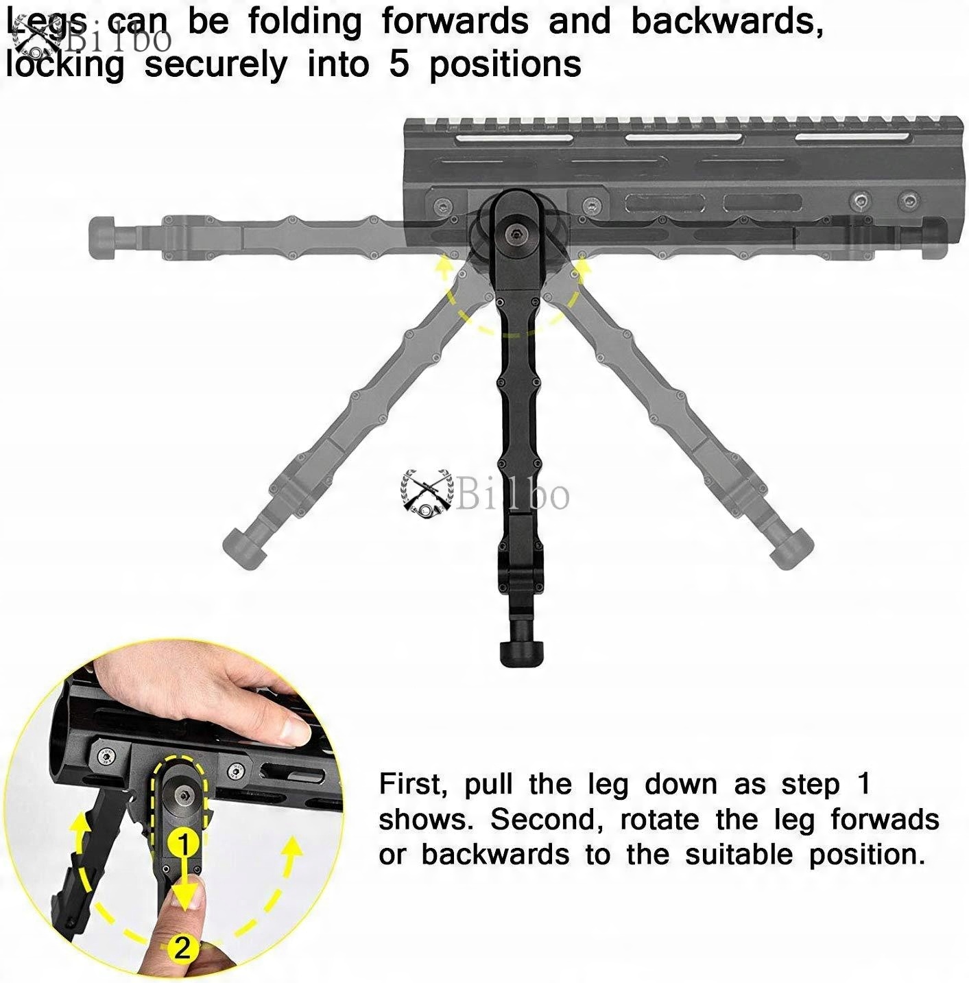 Ніжки сошки складаються вперед і назад, надійно фіксуючись у 5 положеннях.