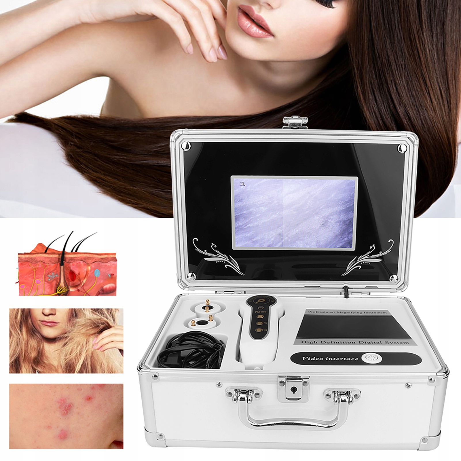 7. Основні функції: виявлення шкіри (епідермальна текстура, пігмент шкіри, вугрі з чорною головою, чорношкірі тощо); Тест розміру пор: тестування електронним мікроскопом, тестування на поверхню за допомогою комп'ютера; Шорсткість шкіри: цифрове вимірювання; пігментація шкіри: жир, червона, пігментація шкіри, плями для шкіри тощо