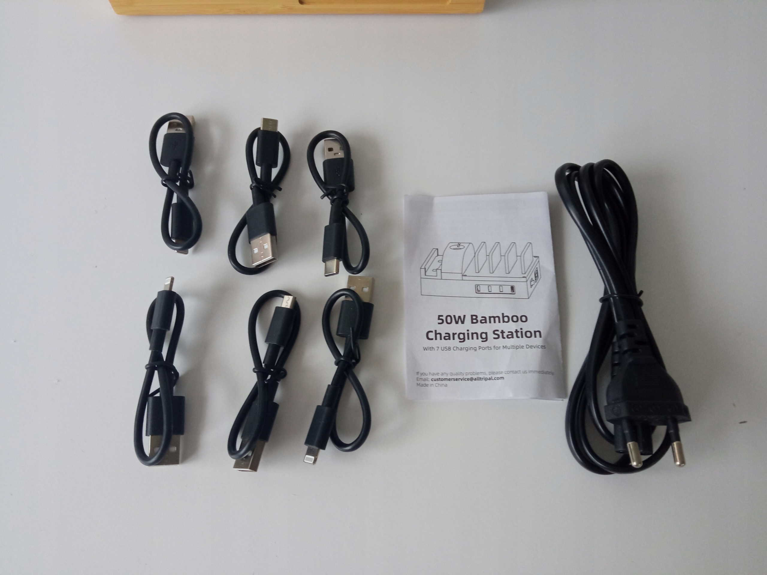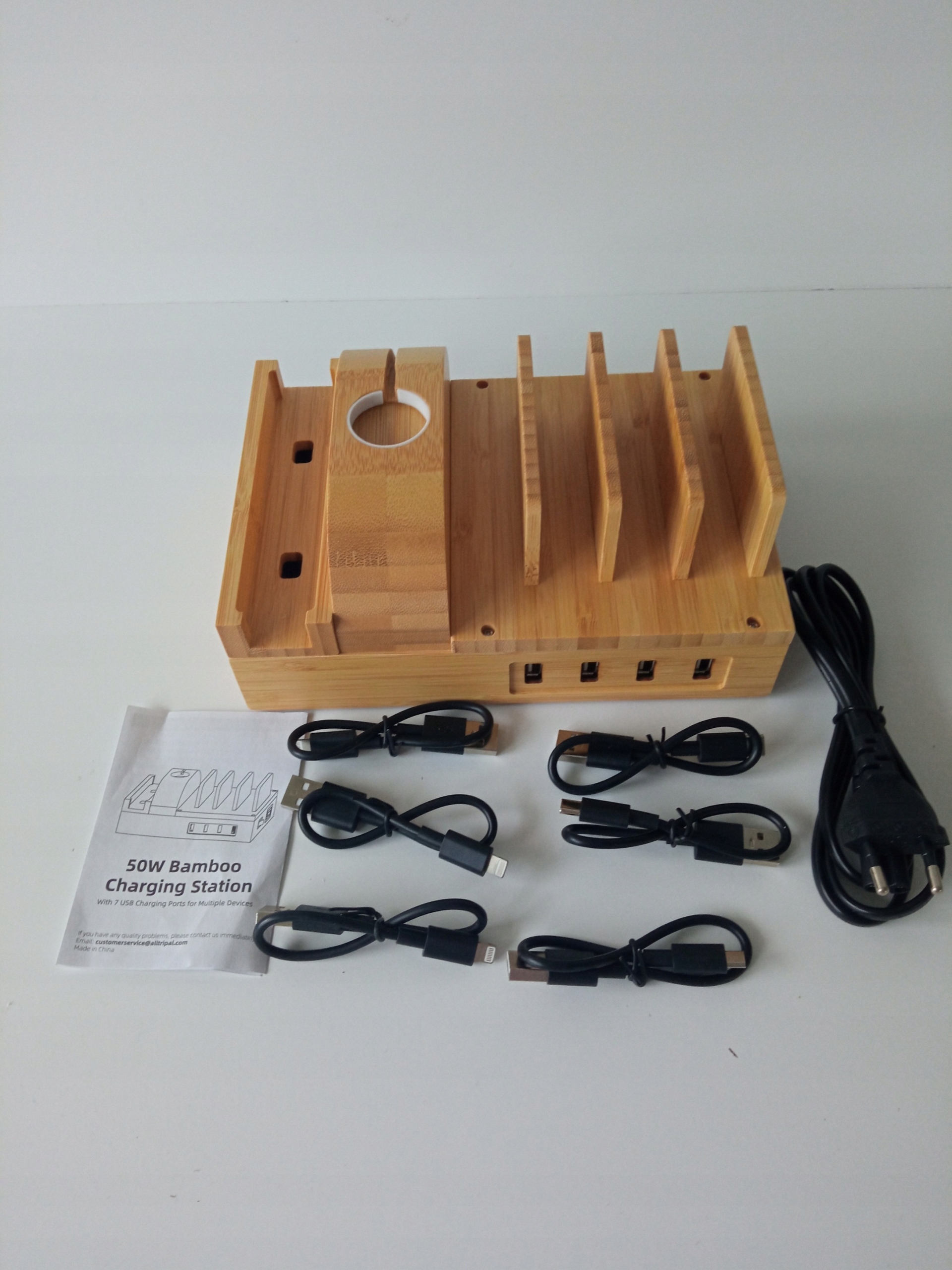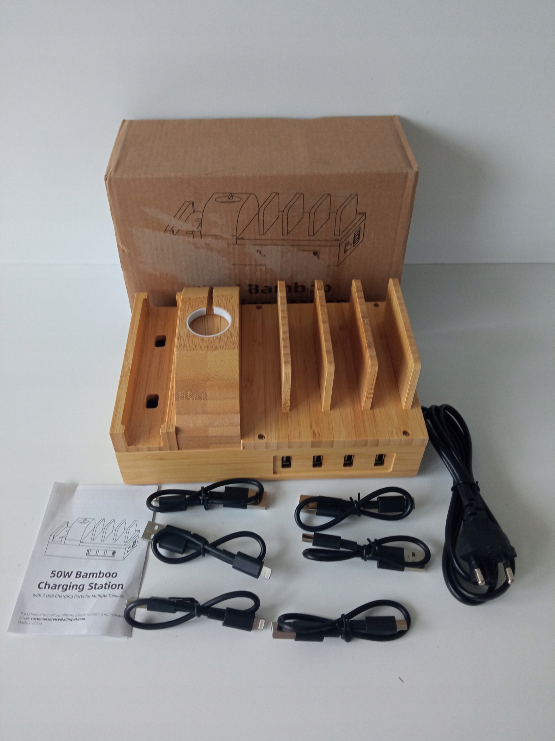 Док-станція Alltripal призначена для організації вашого простору та спрощення процесу заряджання всіх ваших пристроїв. Його надійна конструкція зі справжнього бамбука не тільки міцна, але й екологічно чиста, надаючи столу сучасний і природний характер. Завдяки семи USB-портам загальною потужністю 50 Вт ви можете одночасно заряджати телефон, смарт-годинник, навушники та планшет без використання кількох зарядних пристроїв. Кожен порт автоматично визначає підключений пристрій і регулює струм, забезпечуючи оптимальну швидкість заряджання до 2,4 A на порт. Вбудовані кабелі та спеціальний простір для зберігання гарантують, що все буде на своєму місці.