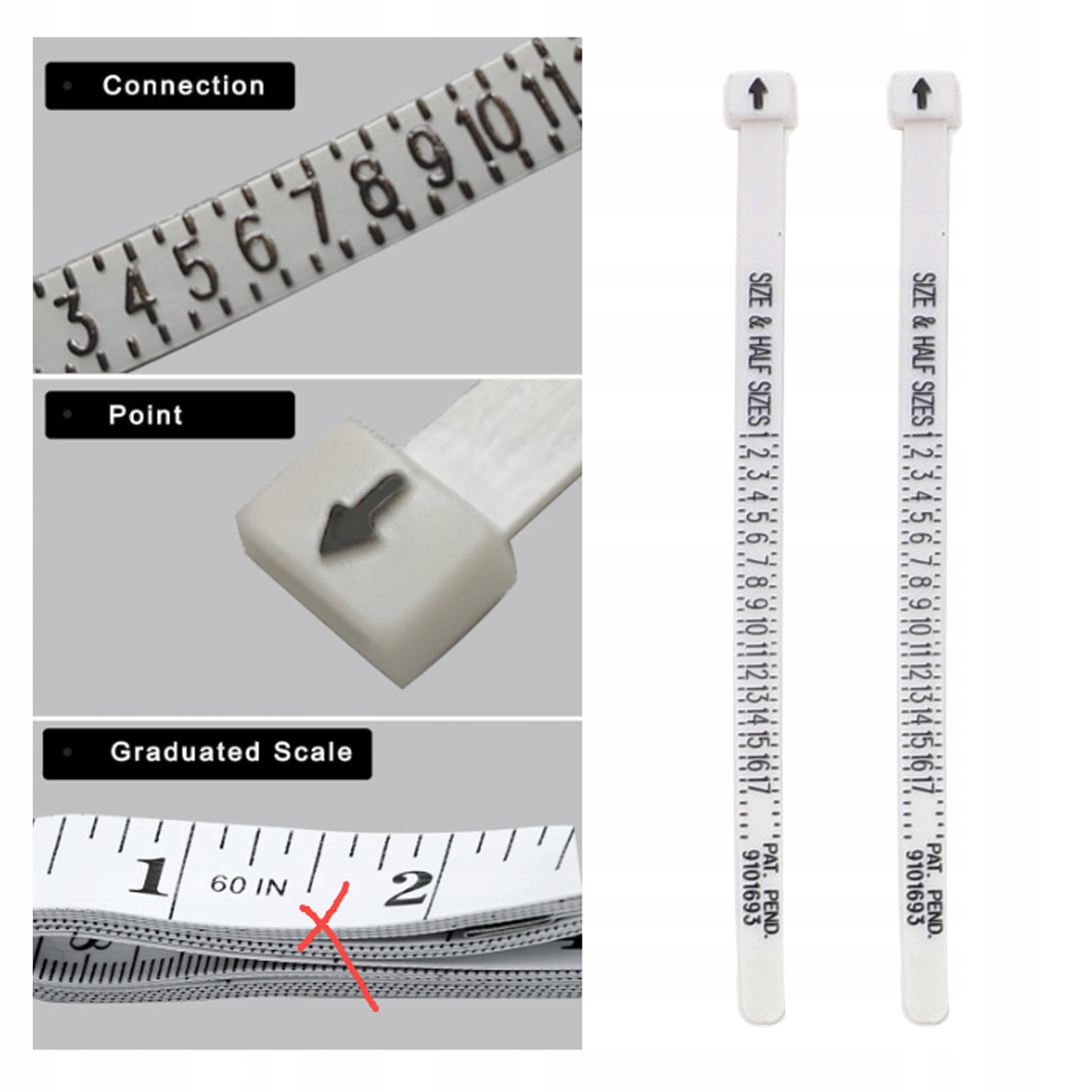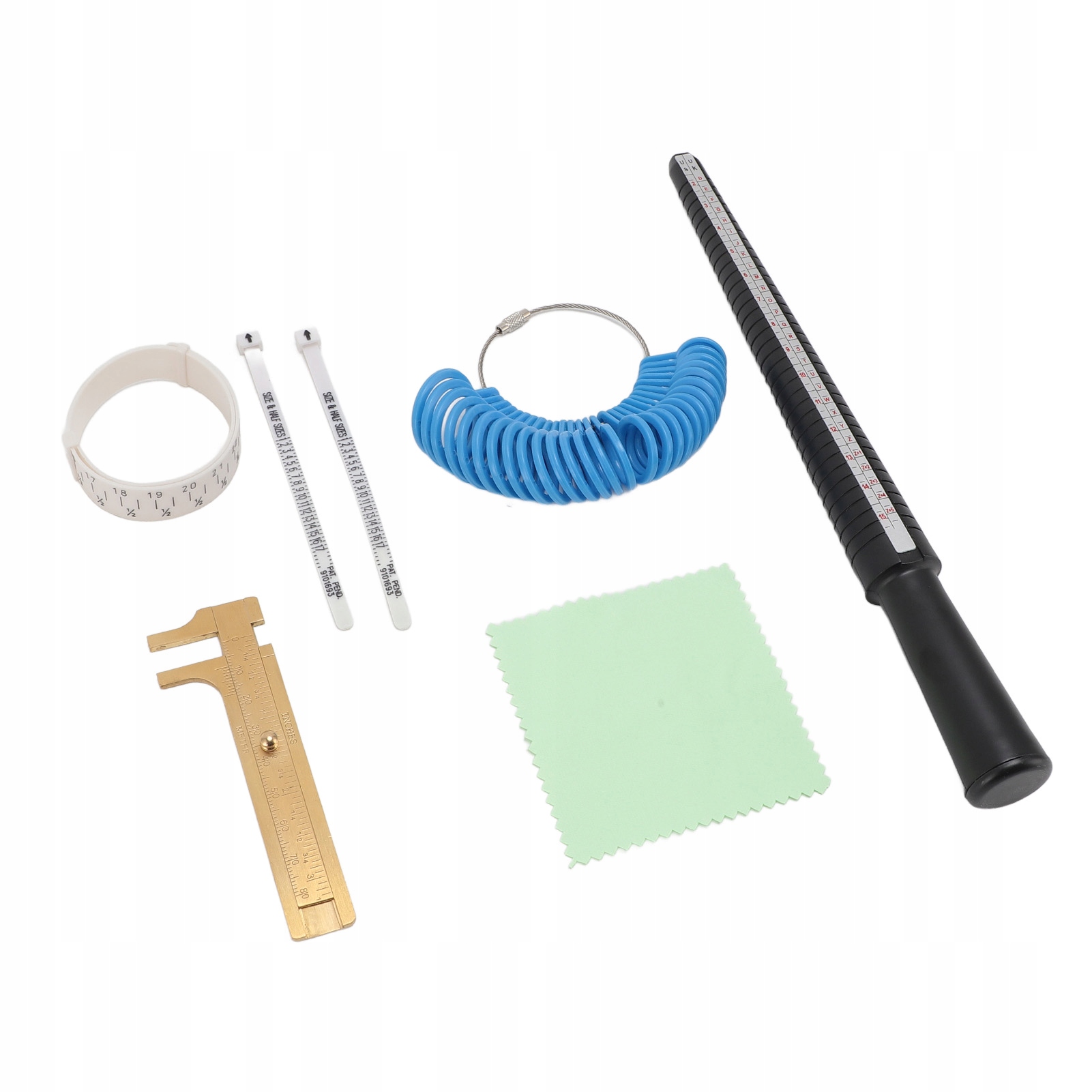 1. Набір вимірювальних інструментів: 7 елементів в одному вимірювальному інструменті, включаючи пластикову кільцеву шпильку, американський метр розміру кільця, розмір розміру браслета з м'якою стрічкою, два заходи розміру кільця з м’якою стрічкою США, міні -суленчками з подвійним масштабом та очисною тканиною, все в одному кільці.