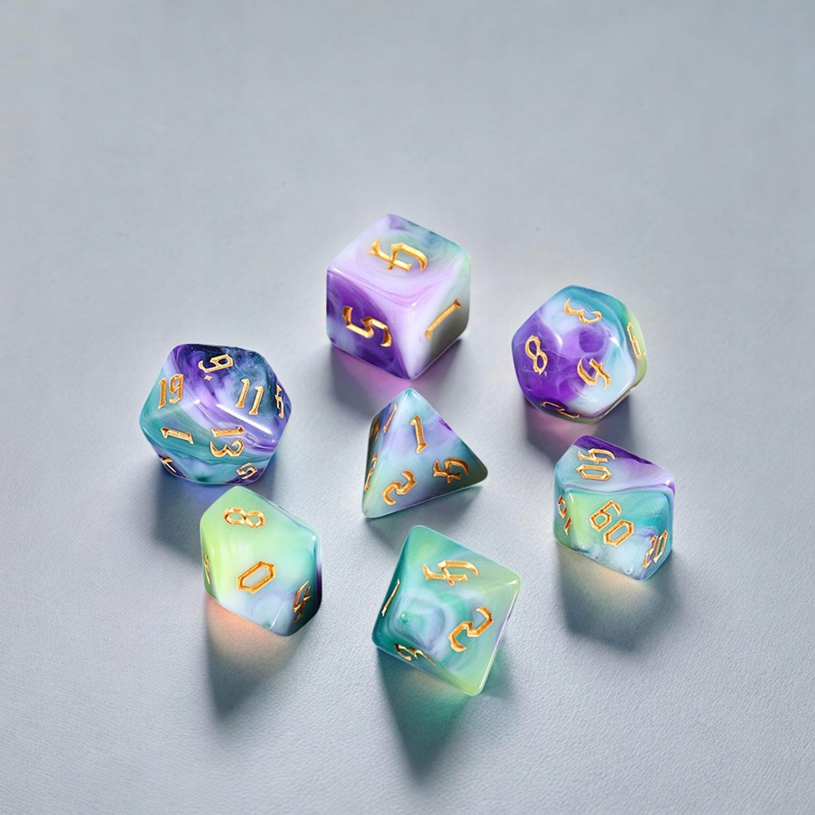 [Пакет містить]: Ви отримаєте 7 багатопологованих кісткових наборів. Містить D20, D12, D10 (00-90 і 0-9), D8, D6, D4.
