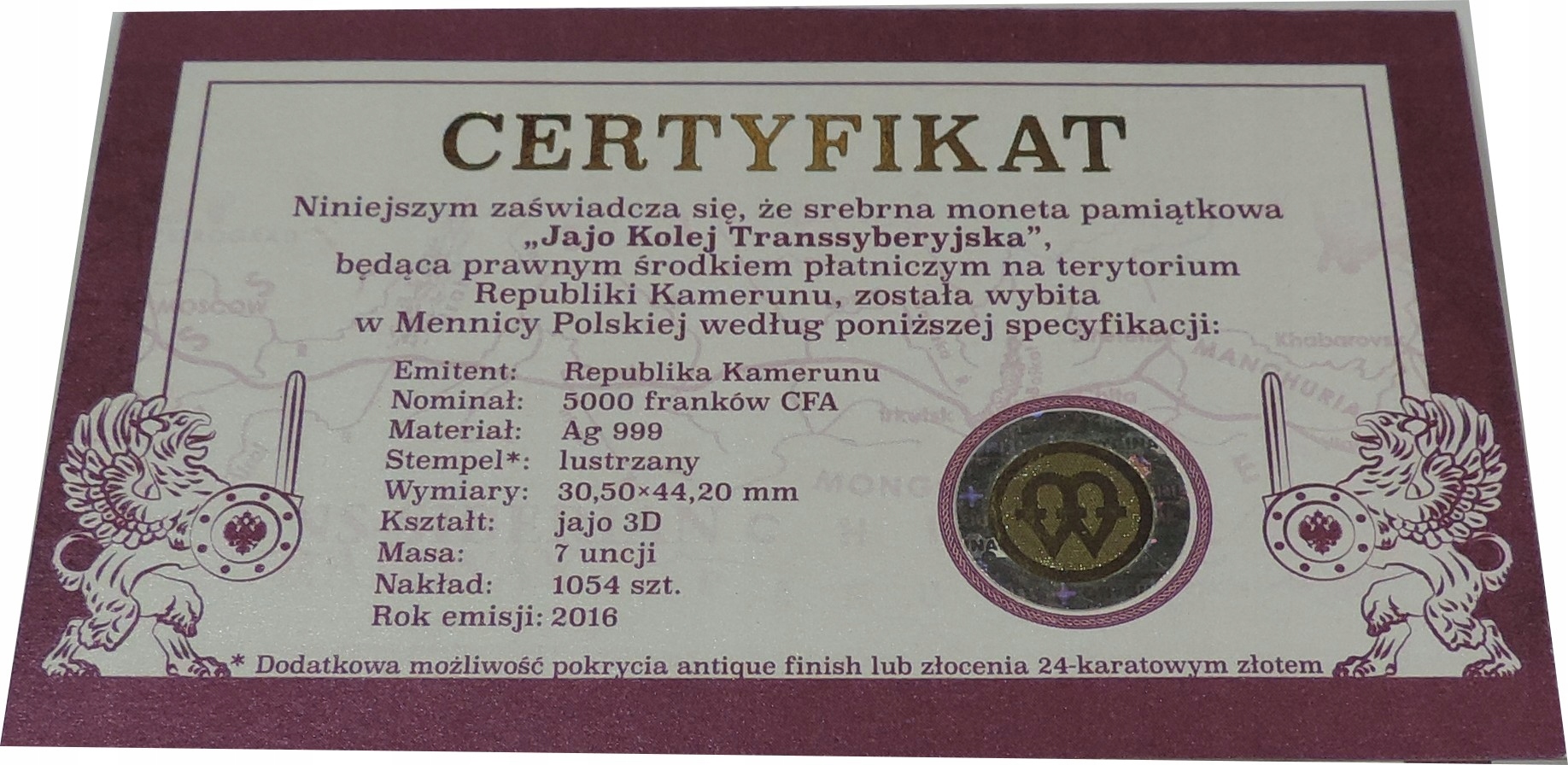 7 UNCJI Ag999- 5000 FRANKÓW 2016 KAMERUN- JAJO KOLEJ TRANSSYBERYJSKA -MKR66
