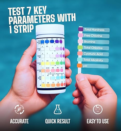 - 7 в 1 - Легка перевірка загальної твердості (TDS), вільного хлору, брому, загального хлору, рН, лужності та ціанухінової кислоти - все з одним легким -використанням -ременем. Занурте у воду протягом 2 секунд, потім утримуйте смуги горизонтально на 45 секунд. Не струшуйте воду і не дозволяйте кольорам. Потім перевірте результат перед сонячним світлом, щоб отримати найкращий результат.