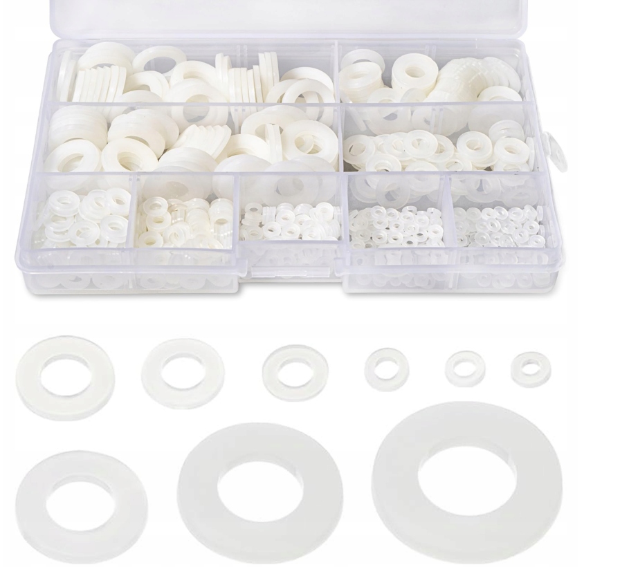 плоскі нейлонові прокладки знайдені в 9 розмірів 700 штук, M2, M2.5, M3, M4, M5, M6, M8, M10, M12 . Найпоширеніша плоска нейлонова прокладка упакована в пластикову коробку, і різні розміри можуть задовольнити ваші різні потреби.
