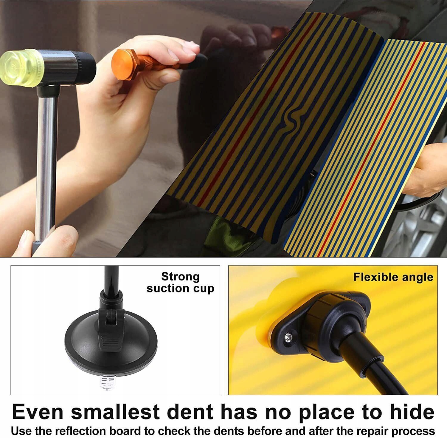 Прості вм'ятини: Набір інструментів PDR містить усі інструменти, необхідні для відновлення вм'ятин у машині. Ми є експертами з ремонту вм'ятин. Незалежно від того, чи є ви початківцем чи професіоналом, ви можете легко ремонтувати вм'ятини в машині. Дно інструменту для видалення вм'ятин виготовляється з гуми і не пошкоджує оригінальну фарбу. Після того, як витягнуть зубні засоби для видалення зубів, ви можете розпорошити клей, що залишився, концентрацією 90% або вище, щоб повністю видалити залишки клею без пошкодження первісної фарби. вм'ятини. Ми також пропонуємо манжети різної форми та розмірів, які є більш товстими і не ламаються легко. У той же час, адгезія наших клеїв у палиці була посилена, і можна видалити вм'ятини в області твердого тіла. Здатний більш ефективно видаляти вм'ятини і, отже, є ефективним рішенням у разі більш серйозної шкоди.
