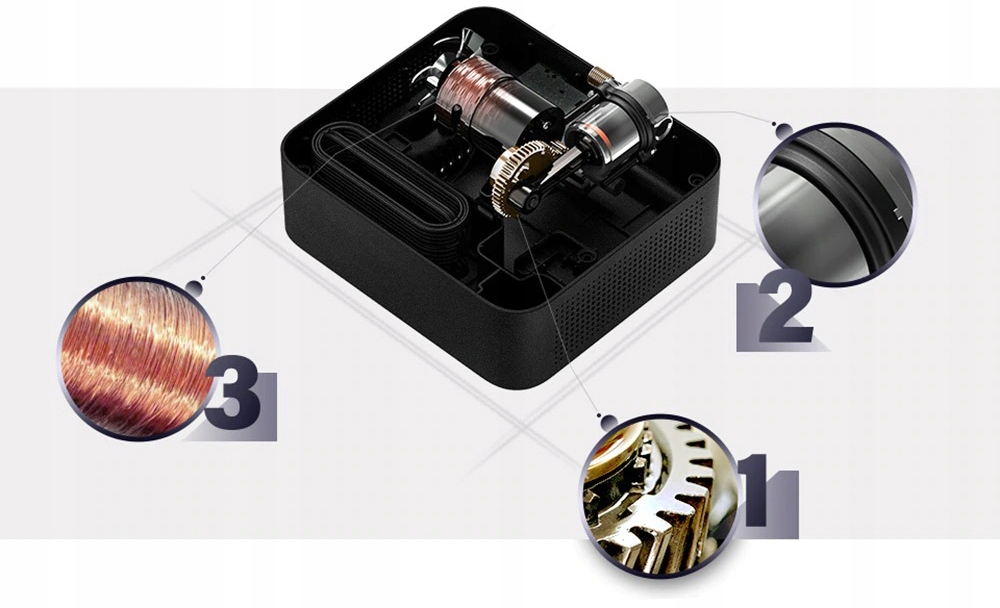 У нього немає акумулятора, і його потрібно під’єднати до прикурювача автомобіля. Кабель живлення досить довгий (3,1 метра), а той, що підключається до колеса, має довжину 0,7 метра.