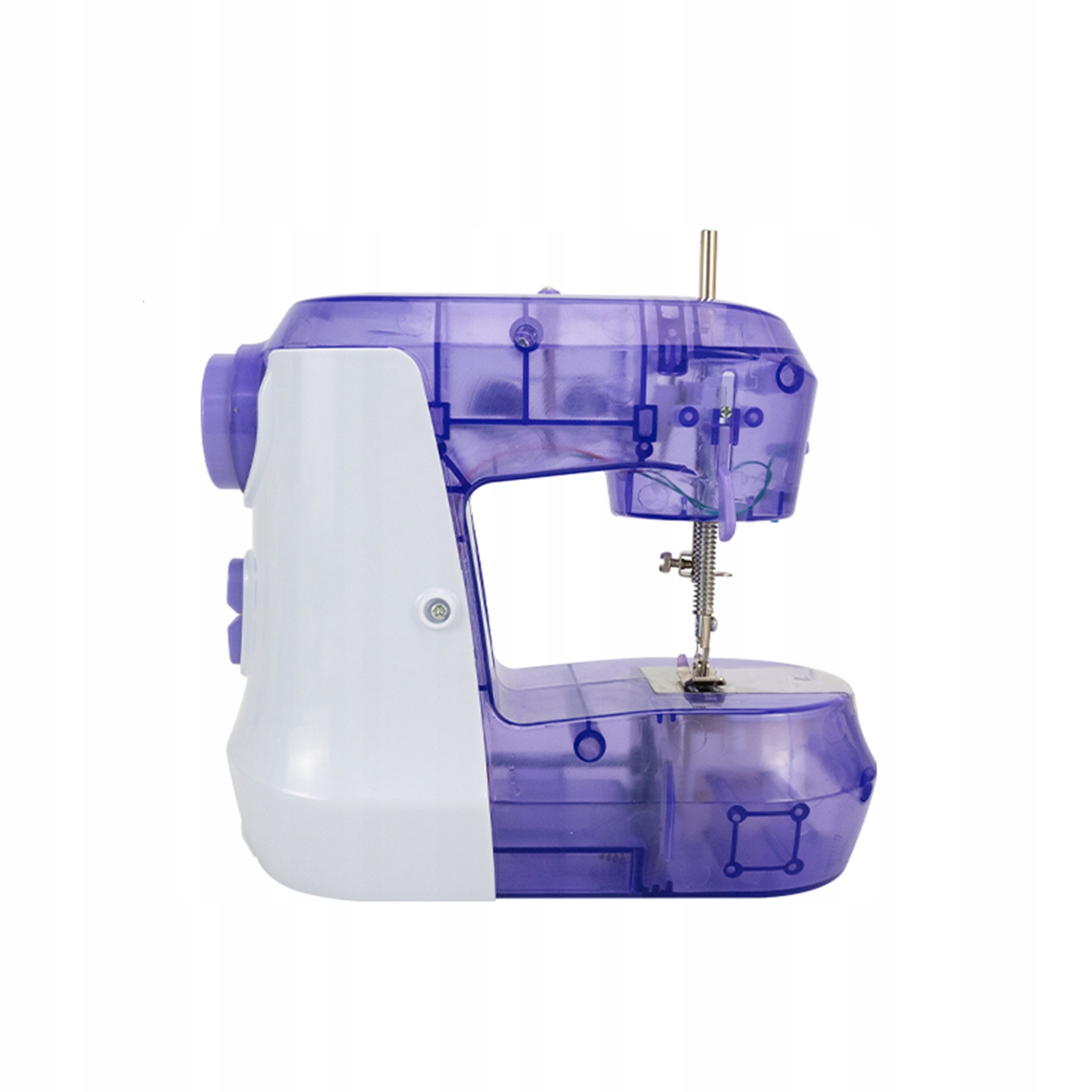 добре обладнаний - Mini Sewing Machine має два типи приводу: стопи та вручну та підтримує подвійну систему стібків. Машина має автоматичне управління шиттям та 2 налаштування швидкості. Машина може живитися від батарей або джерела живлення 230 В. Ця версія машини не має вбудованого джерела світла. Після зняття машини з упаковки на його механізмі можуть бути сліди масла.