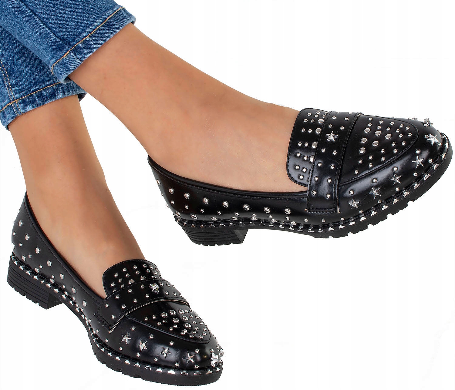 Унікальні мокасини з екологічної шкіри на профільованій плоскій підошві. Красивий, глибокий чорний колір і ефектні прикраси у вигляді шпильок. Модель зроблена якісно і ретельно. Взуття ідеальне для створення наймодніших стилів!