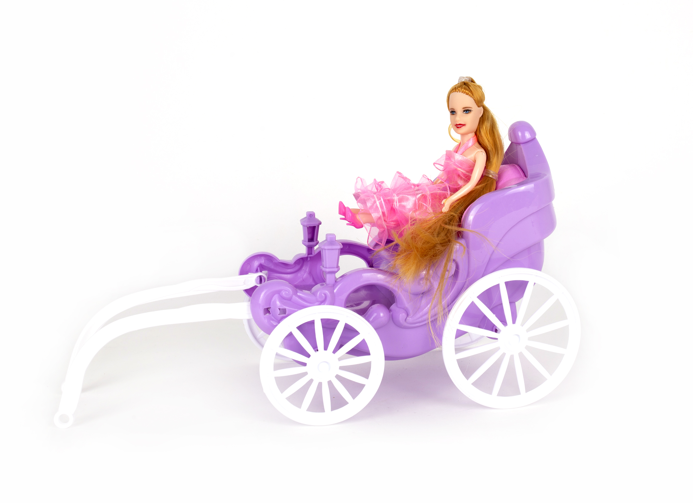 Чудова лялька в колясці — пропозиція для кожної дівчинки, яка любить мобільні іграшки. Чарівна лялька з довгим волоссям, вишукано одягнена в рожеву сукню, в рожевій кареті поїде в замок на бал.