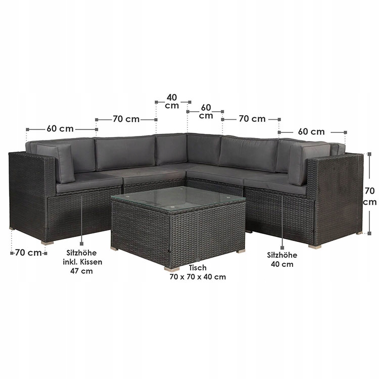 З чорним садовим куточком з поліротангу ви перетворите свій відкритий простір на стильне місце для відпочинку та відпочинку. Міцна сталева конструкція та стійкі до погодних умов поліротангові волокна роблять меблі, розміщені на терасі під альтанкою або в саду, дуже привабливими. Невеликий столик зі скляною стільницею служить місцем для розміщення їжі та напоїв. Товсті подушки для сидіння та спинки гарантують тривалий комфорт. Світські вечори з родиною, друзями чи сусідами стануть чудовим відпочинком на свіжому повітрі.
