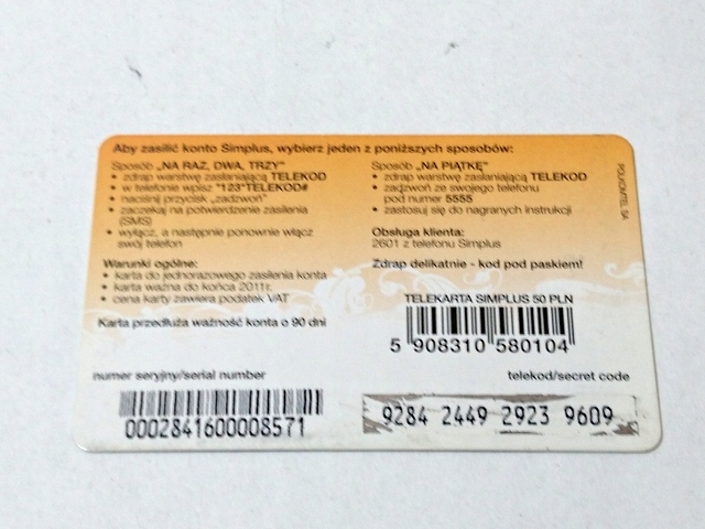 Просматривая «773 - ТЕЛЕФОННАЯ КАРТА SIMPLUS - 50», вы можете быть уверены, что данный товар из каталога «Телефонні картки» будет доставлен из Польши и проверен на целостность. В цене товара, указанной на сайте, учтена доставка из Польши. Внимание!!! Товары для Евросоюза, согласно законодательству стран Евросоюза, могут отличаться упаковкой или наполнением.