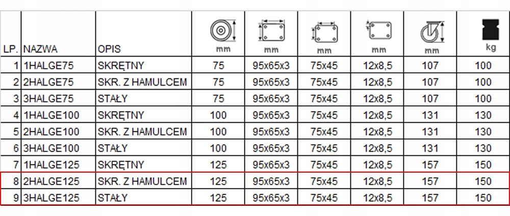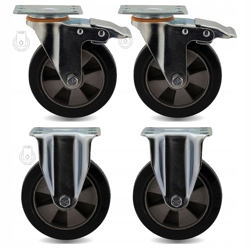 Набір складається з чотирьох коліс, оснащених пластиною. У комплект входить два фіксованих комплекти з кодом 3HALGE125K2 (поз. 9 в таблиці) + стійка і два поворотних колеса з гальмом з кодом 2HALGE125K2 (поз. 8 в таблиці) + підставка.