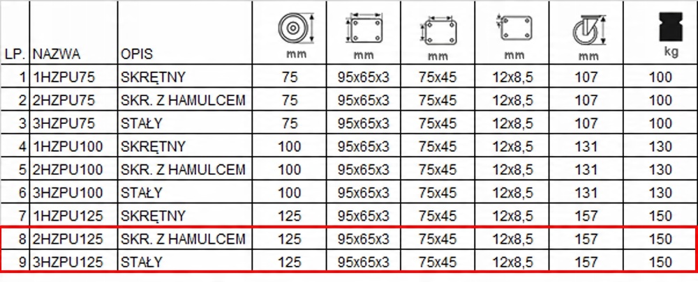 Набір складається з чотирьох коліс, оснащених кріпленням тарілки. Набір включає два постійних наборів з кодом 3HZPI125K2 (пункт 9 у таблиці) та два колеса кручення з кодом з кодом 2HZPI125K2 (пункт 8 у таблиці). оцинкований.