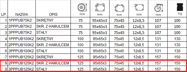 - Корпус Виготовлені сталеві листи з високою довжиною. Плитка має розміри 95x65x3 мм. Колеса мають діаметр 125 мм, а центри кріплення мають розмір 75 х 45 мм і овальні отвори для кріплення розміром 12 х 8,5 мм. Загальна висота - 157 мм + 125 мм. Колеса мають міцність 150 кг на колесо. Вони використовуються повільно, вони стійкі до пошкодження, поглинання ударів та вібрацій. Вони обертають 360 градусів, полегшуючи маневрування меблями або коляскою. Вони плавно обертаються на твердих і гладких поверхнях, як бетон з дуже маленьким тертям.